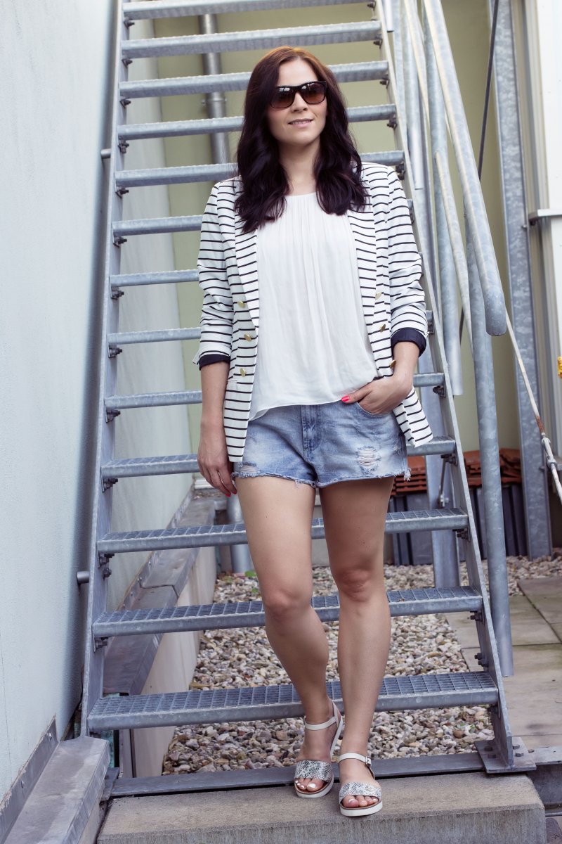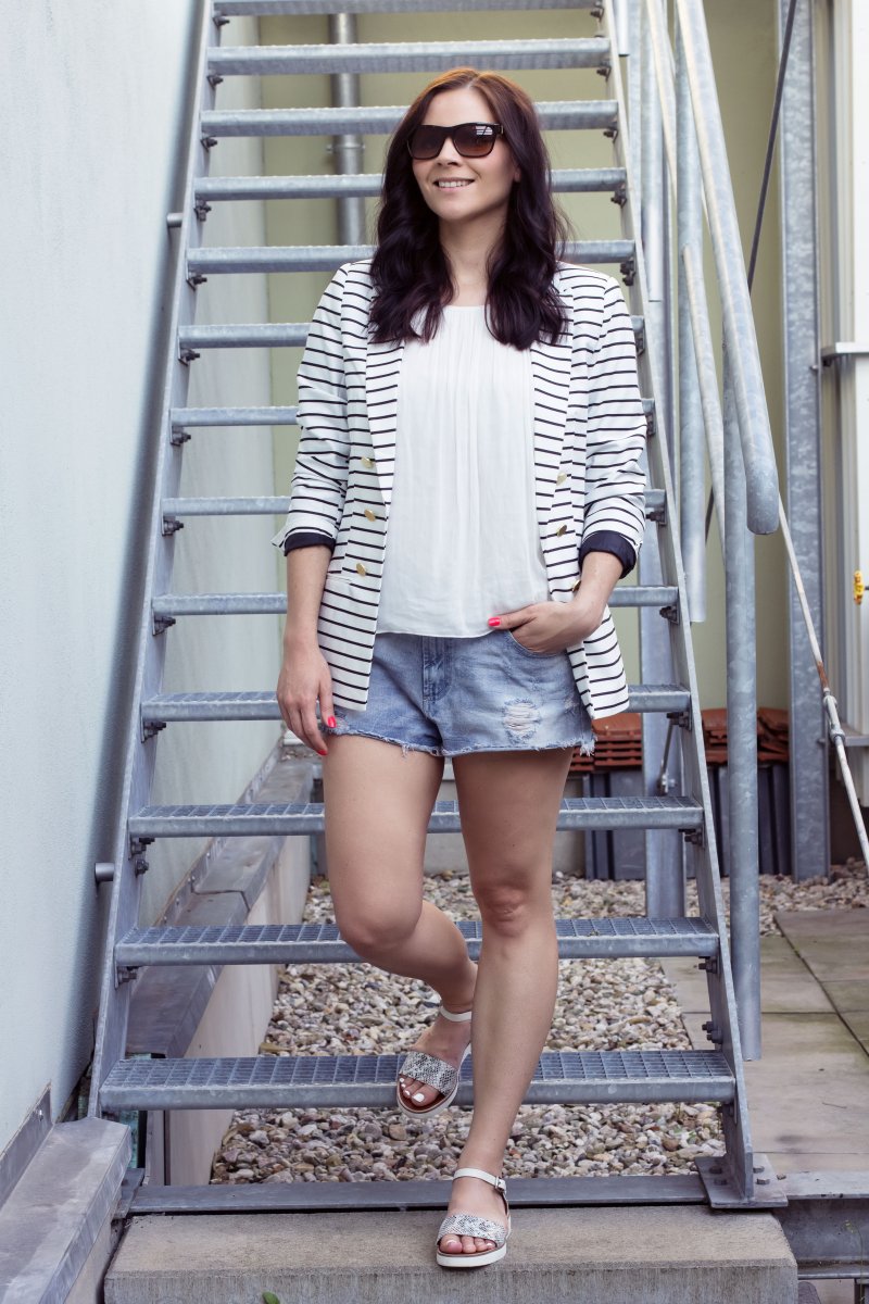 Aber zurück zum Outfit. Zur Shorts trage ich eine schlichte weiße Bluse von Zara und meinen gestreiften Blazer von H&M. Er peppt den Look auf und verleiht ihm die nötige Chicness. Ebenfalls von H&M sind die weißen Plateau-Sanden, die ich an den Füßen trage.