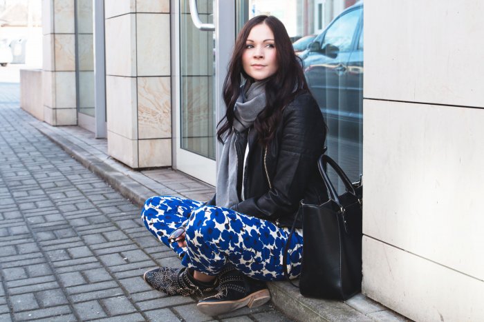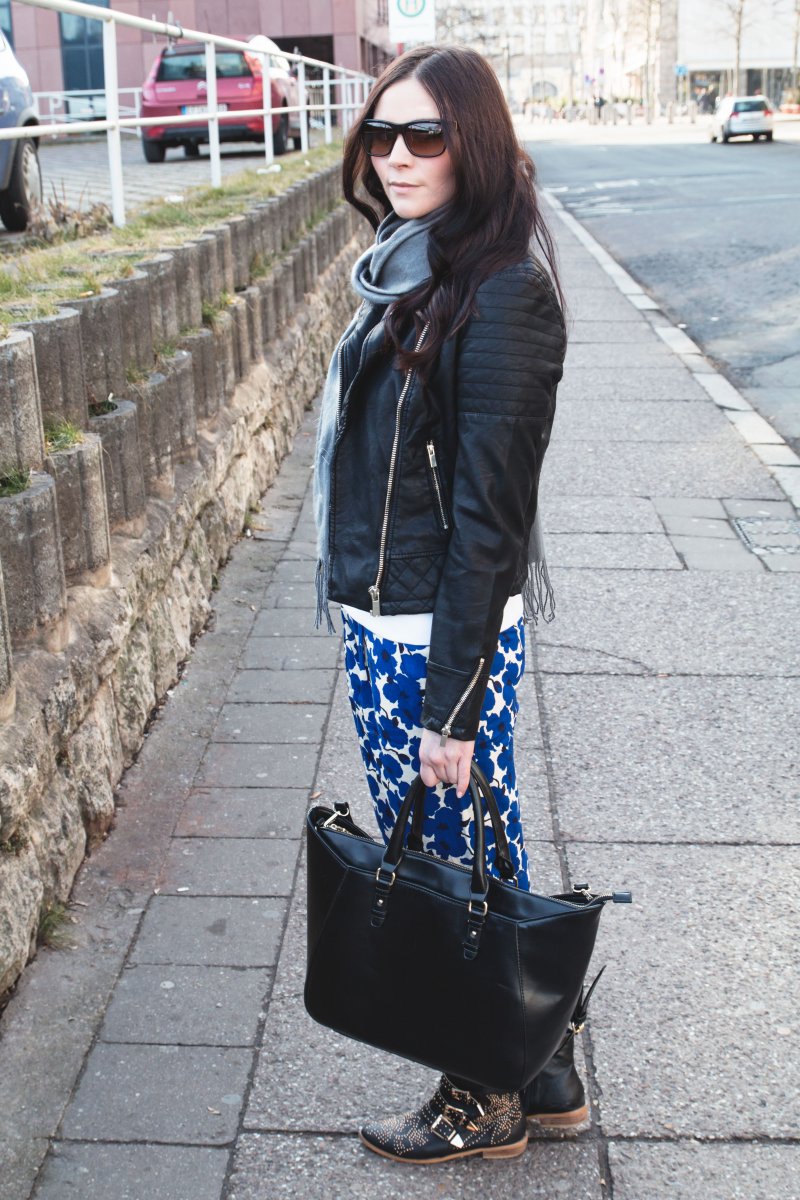 Musterhosen habe ich bisher immer nur elegant kombiniert. Zum Beispiel in meinem Gelb und Blau im Mustermix Outfit oder Spring Print Trousers Look habe ich die gemusterten Hosen mit viel Farbe und Chic in Szene gesetzt. Dass es auch anders geht, beweise ich euch heute mit der Lederjacke von Miss Selfridge, die ich mir frisch zugelegt habe. Sie lässt die blau geblümte Musterhose in einem ganz anderen Stil erscheinen und nimmt ihr die verspielte Weiblichkeit.