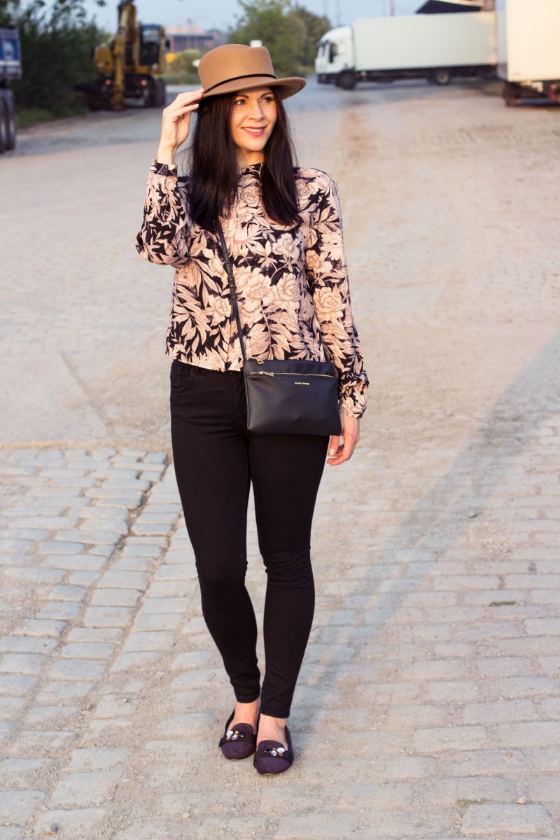 Der Herbst steht für warme und sinnliche Farben. Typisch sind Töne wie Bordeaux-Rot, Senfgelb, Braun, Violett, Mitternachtsblau und Jägergrün. Mein Herz schlägt diese Saison ganz besonders für die violetten Töne. Ganz vernarrt bin ich in Farbkombinationen aus Rosa, Violett und Braun. Vortrefflich in das Beuteschema hinein passt die herbstliche Musterbluse von H&M. Neben den Farben begeistert mich der gerade Blusenschnitt, der die neue BDG Jeans gekonnt in Szene setzt.