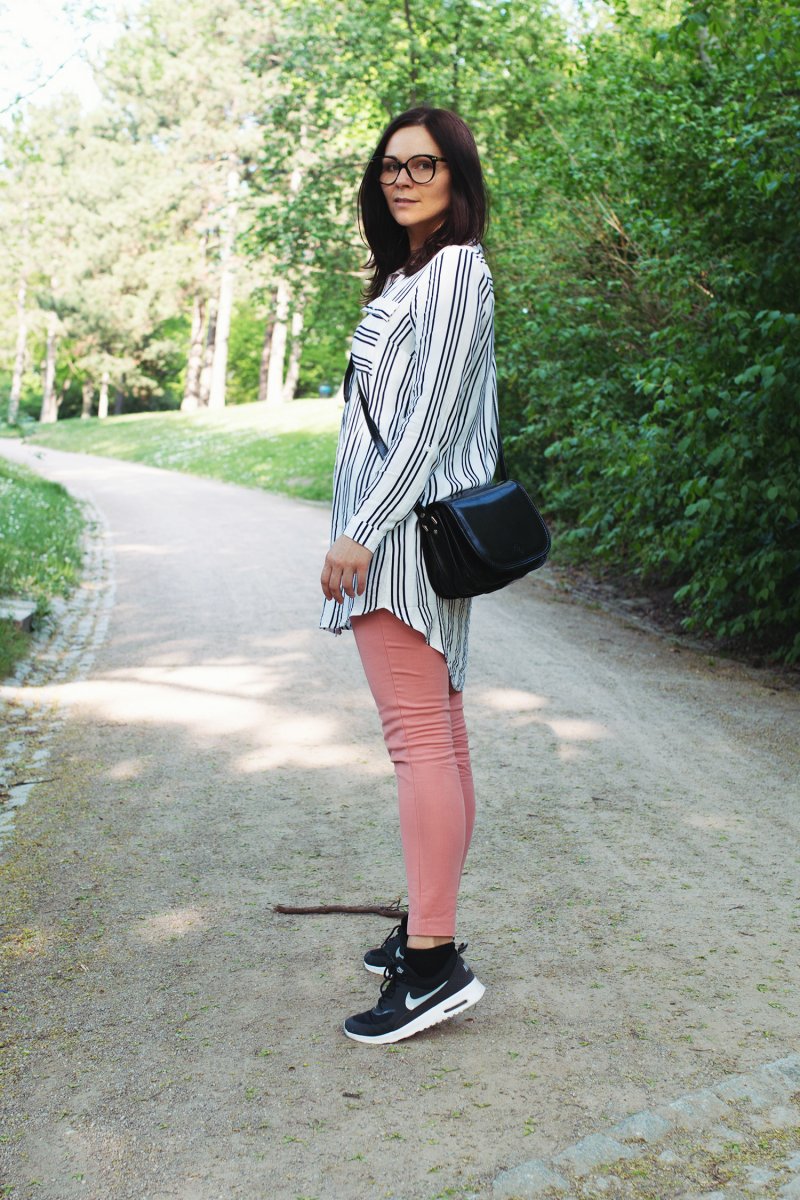 Mein heutiger Look ist eine Mischung aus sportlich und elegant. Dieses Outfit habe ich am Sonntag getragen, als wir Lillie abgeholt haben. Eine Outfitkombination, die ich sehr gerne im Alltag trage. Ich kombiniere meine neue Marc Jacobs Brille zu Nike Sneakers. Vom Stil her sind beide Teile sehr unterschiedlich, aber dennoch haben sie eins gemeinsam: sie sind Schwarz. Schwarz setzt in meinem heutigen Look die Akzente und ist ein schöner Kontrast zu den hellen und sanften Frühlingstönen der Hose und der Bluse.