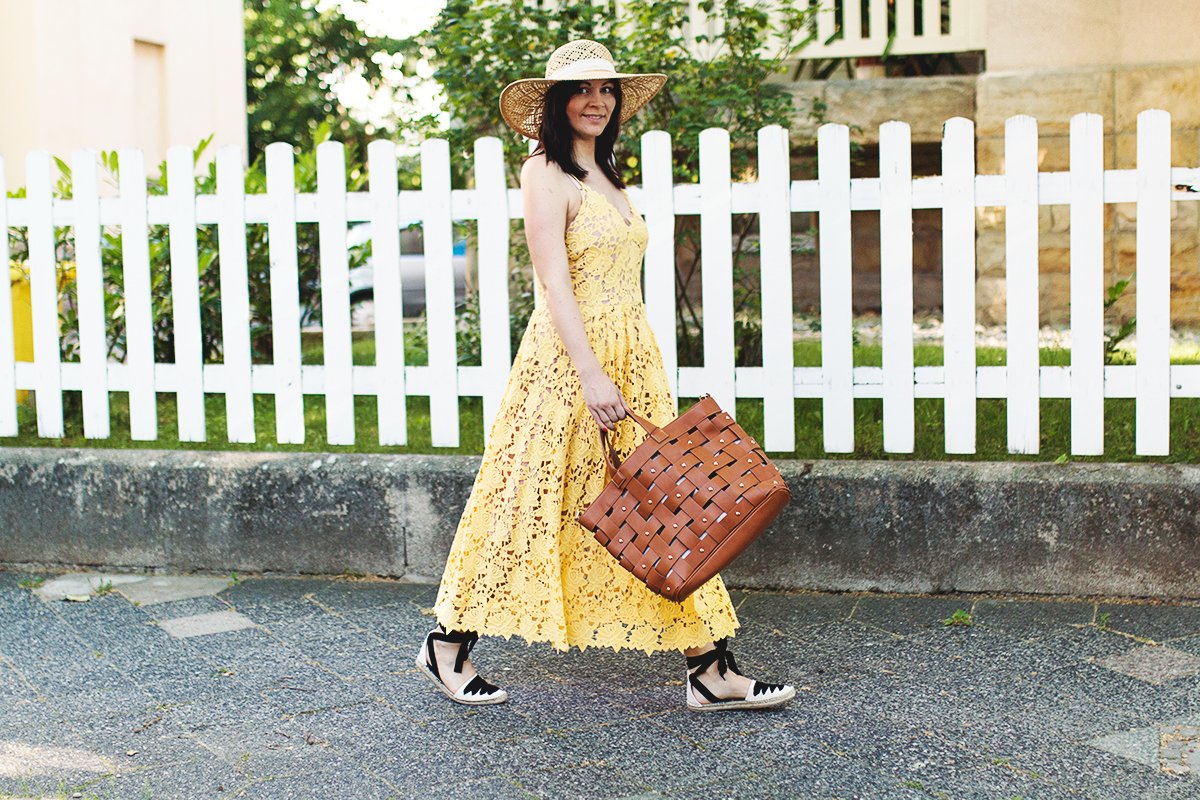 Das letzte Kleid in der Runde, ist ein Kleid aus Spitze. Spitze wirkt sehr elegant und passt einfach super in den Sommer. Am liebsten kombiniere ich es zu flachen Sandalen und ausgefallenen Strohhüten. Sie wie in diesem Outfit mit gelbem Spitzenkleid.