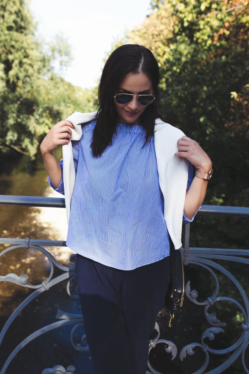 In meinem heutigen Outfit setzte ich auf einen sportlich-eleganten Mix, was die Outfit-Wahl betrifft. Ich trage eine Off-Shoulder Bluse zu einer gemütlichen Hose in Dunkelblau. Die Hose ist am Knöchel mit einem Bund eingefasst, was sie zum sportlichen Begleiter für unsere Radtour werden lässt. Welche Schuhe würden da besser zu der Hose passen, als meine heiß geliebten Stan Smith Sneakers von Adidas. Diese Schuhe werden mich auch diesen Herbst/Winter wieder begleiten, zumindest solange wie es wettertechnisch möglich ist.