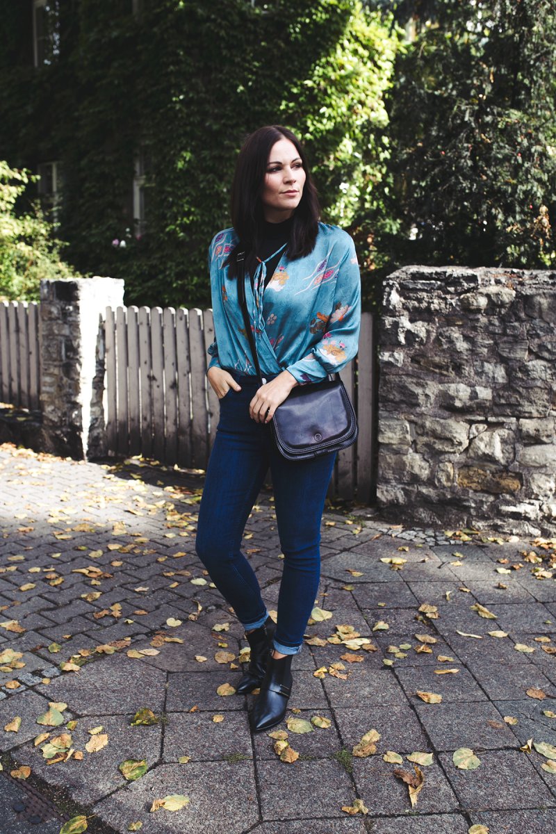 Bodys trage ich derzeit super gerne, das habe ich euch schon in meinem Wohlfühloutfitpost verraten. Heute zeige ich euch einen weiteren Body, aber diesmal mit auffälligem Muster und aus glänzendem Material. Der blaue Body mit dezentem Blumenmuster ist das Highlight meines heutigen Looks und bringt definitiv Farbe in den derzeit grauen Alltag. Unter dem Body trage ich noch einen dünnen Rollkragenpulli, der meinen Hals schön warm eingepackt hält.