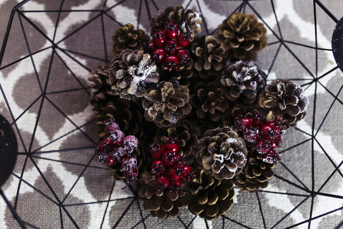 3. Arrangiert nun Zapfen und Zweige in der Dekoschale, bis ihr mit dem Ergebnis zufrieden seid. Ich habe die Zapfen wild in der Schale gemixt.