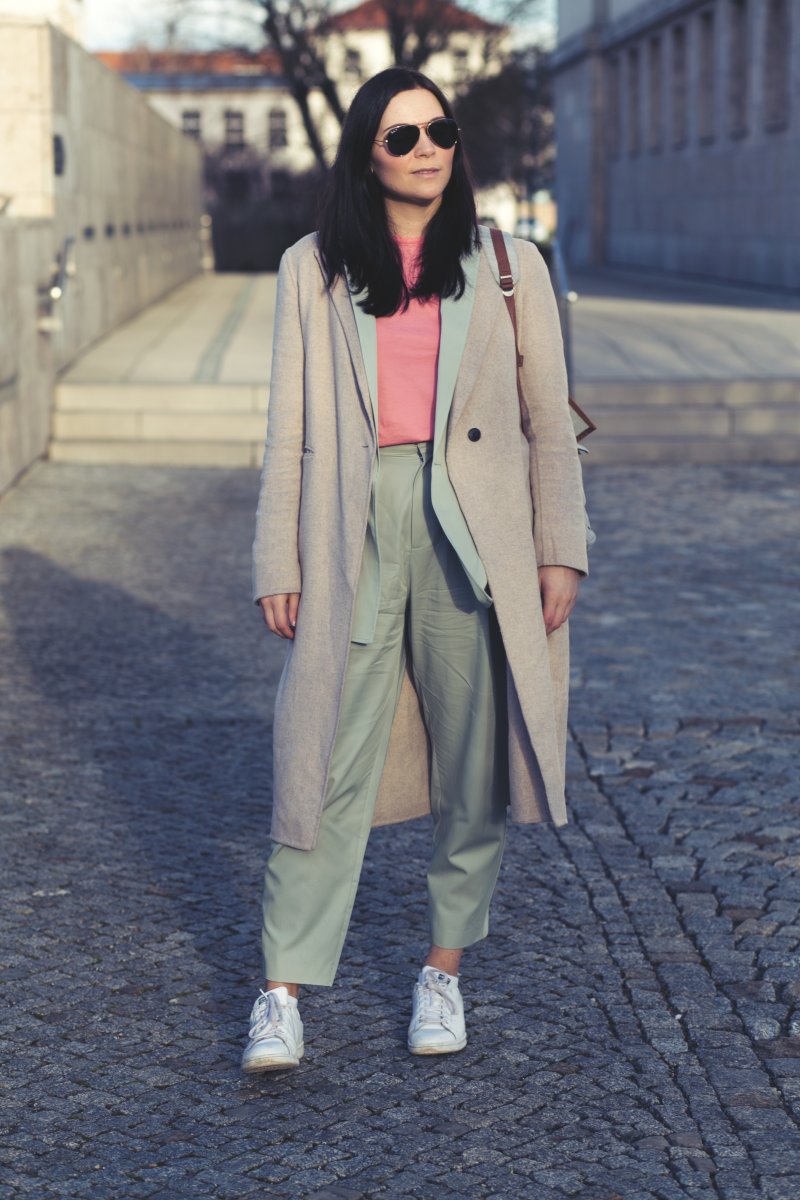 Im Frühling ist Farbe bei mir ein Muss. Am liebsten trage ich einen Mix aus Pastell und Pop of Color. So wie auch heute, in meinem Outfit für das Fashionkarussell. Ich kombiniere einen pastellgrünen Hosenanzug zu einen knall-pinken Shirt von Kauf dich Glücklich. Eine gewagte Kombination, die sich aber durchaus sehen lassen kann. Obwohl es superschönes Sonnenwetter an diesem Tag war, darf der Mantel bei mir nicht fehlen. Denn es trotz der warmen Sonnenstrahlen noch sehr frisch, wenn ich aus dem Haus gehe. Warmhalten ist deshalb Pflicht.