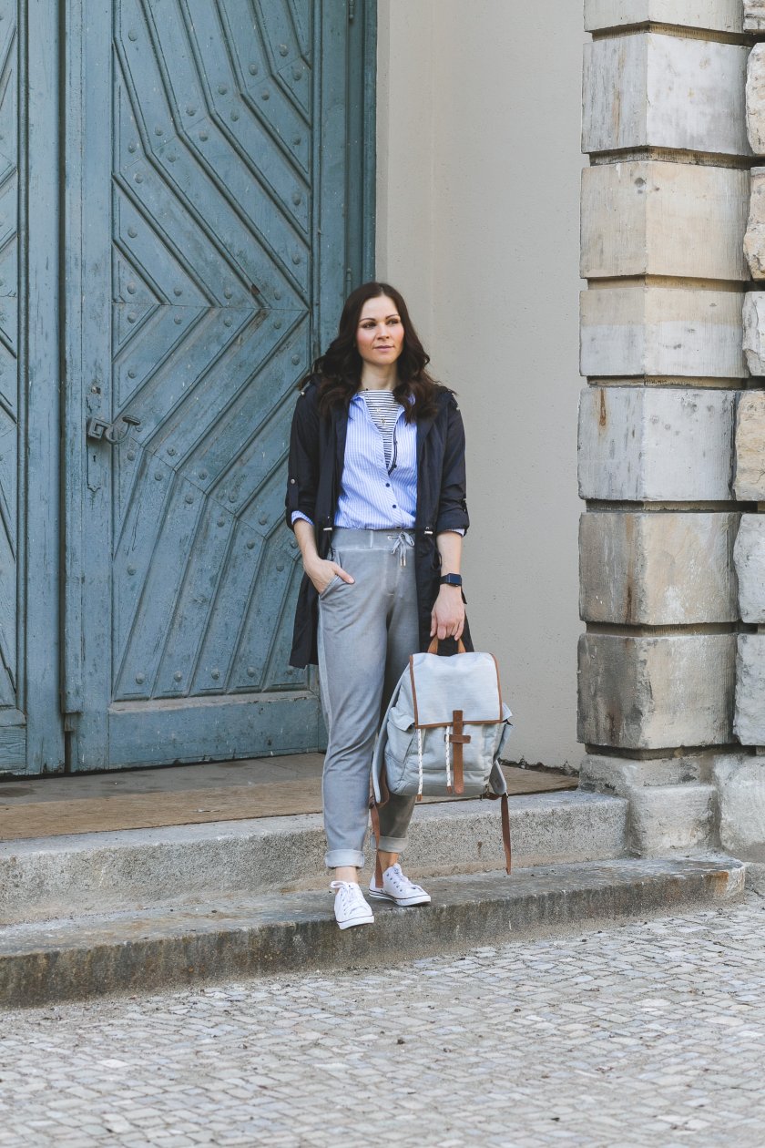 Aus der Kollektion habe ich mir einen dunkelblauen Parka ausgesucht, der mich bei grauen Tagen und kleinen Regenschauern schön trocken hält. Dazu habe ich ein Streifenshirt kombiniert, welches ich mit einem gestreiften Blusenkleid komplettiert habe. Ihr werdet euch jetzt wundern! Das Kleid sieht eher aus wie ein Hemd! Das liegt daran, das ich es kurzerhand in die Hose gesteckt habe. Wie ihr wisst,, bin ich ja ein riesiger Fan davon, Teile vielseitig in meine Styles zu integrieren, das ist mit diesem Blusenkleid auf jeden Fall spielend zu erledigen. Dieser Style lässt sich an heißen Sommertagen aber auch problemlos mit nackigen Beinen austragen – das ist das Schöne an so vielseitigen Kleidungstücken.