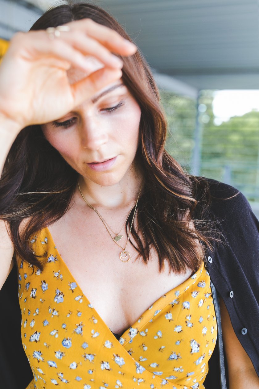 Das Kernstück meines heutigen Outfits ist definitiv das gelb-geblümte Sommerkleid. Das Kleid in gemütlicher Midilänge zieht alle Blicke auf sich und ist zudem im trendigen Wrap-Dress-Stil geschnitten. Besonders gut an diesem Kleid gefällt mir das Material. Es liegt sehr leicht auf der Haut und bringt einem an heißen Sommertragen auch nicht ins Schwitzen. Neben dem Material habe ich mich auch in die Details des Kleides verliebt. Die unauffälligen Rüschen an der Vorderseite des Kleides lassen es verspielt wirken und zugleich elegante.