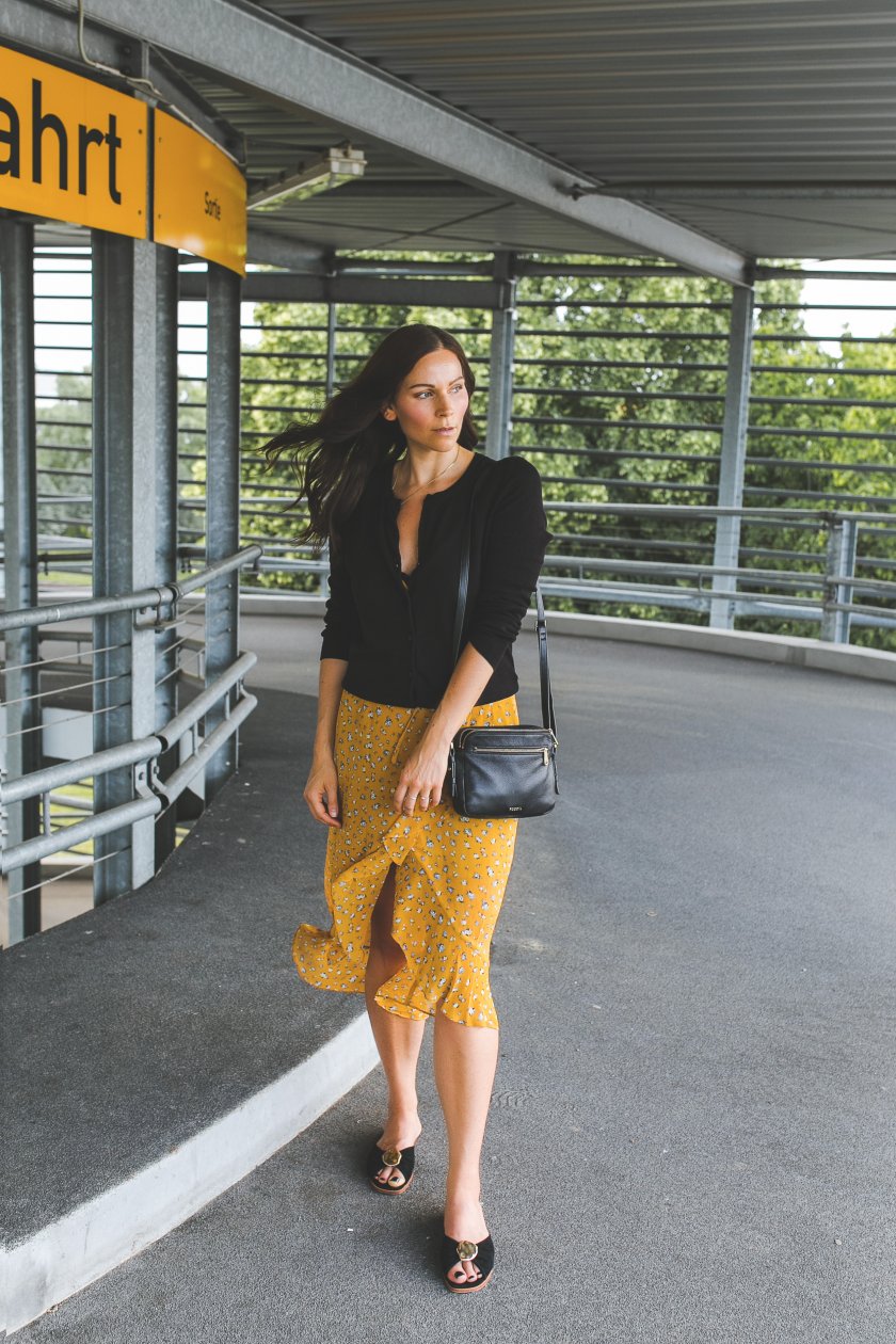 Kombiniert habe ich das gelbe Midikleid mit dezenten Accessoires in Schwarz. Zum einen mit meinen Flattered Sandalen, die ich bereits im letzten Sommer lieben gelernt habe und meiner Fossil Pieper Tasche, ebenfalls eine alte Bekannte hier auf dem Blog. Neu hinzugekommen ist der schwarze Cardigan. Der an lauen Sommernächsten den Look auf gekonnte Weise abrundet und mich warm hält.
