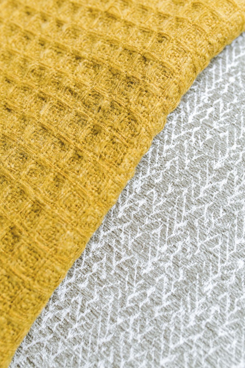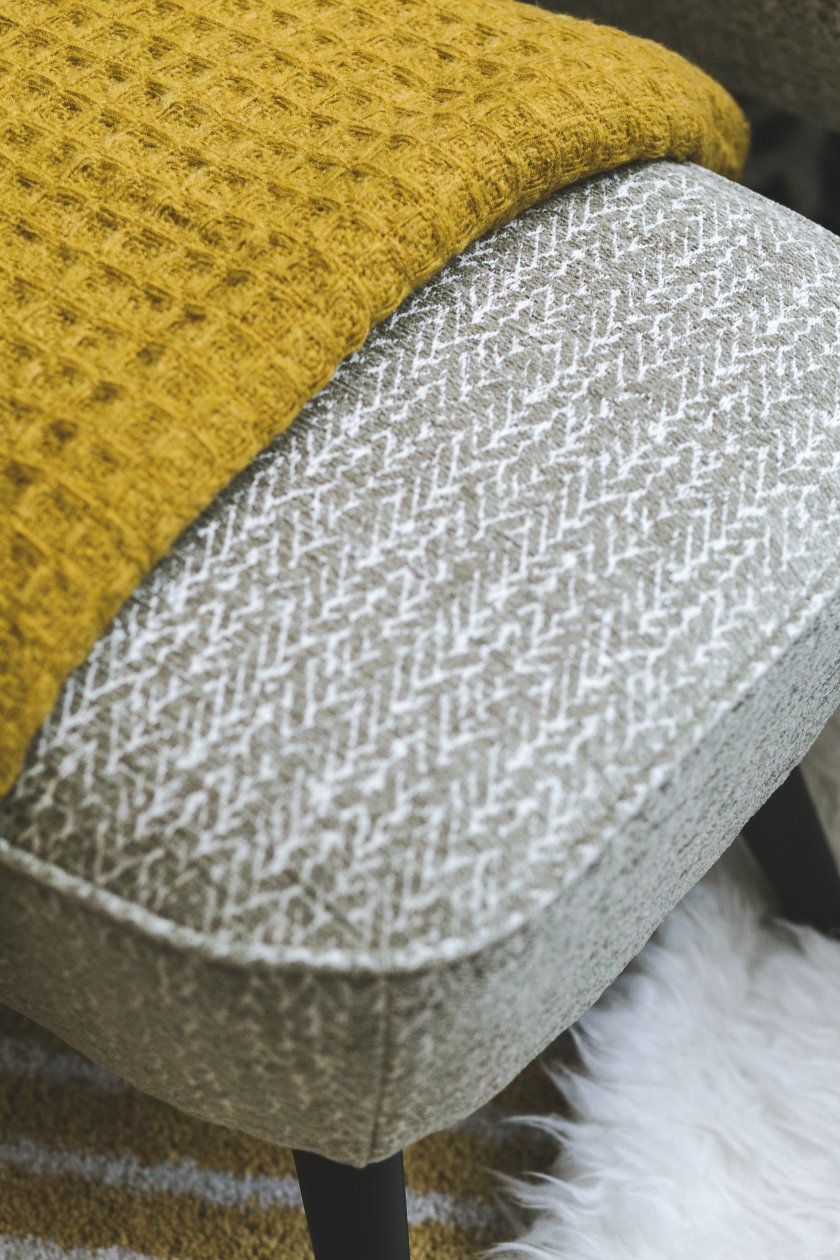 Ich bin eine kleine Frostbeule und friere auch mal gerne im Sommer. Deshalb darf in meiner Leseecke ein gemütliches Plaid natürlich nicht fehlen. Ich habe mich hier für das Modell Zuiver Mimosa entschieden, das in einem auffälligen Senfgelb daher kommt. Senfgelb ist ebenfalls das kleine Kissen, das den Sessel in einen auffälligen Eyecatcher verwandelt. Es kommt ebenfalls in einem Senfgelb daher und hört auf den schönen Namen FEST Amsterdam Anorak.