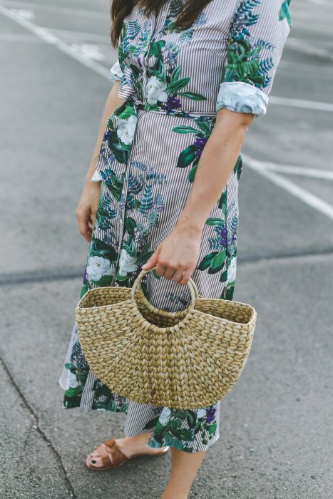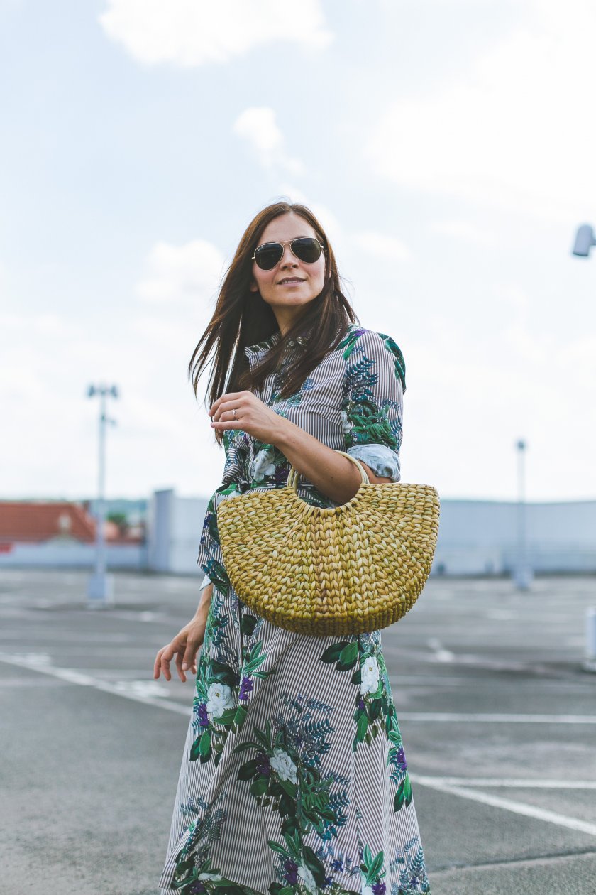 Blusenkleider finde ich total schön und mir gefällt an deinem Kleid ganz besonders die Mischung aus Blumenprint und Streifenmuster. Die Kombination mit der Korbtasche ist zudem einfach perfekt. Insgesamt ein super toller Look für den Sommer, den ich auf jeden Fall auch so anziehen würde.
