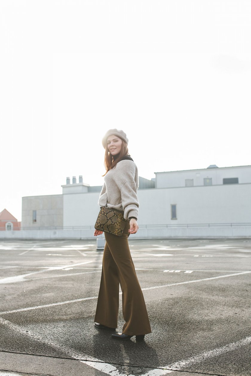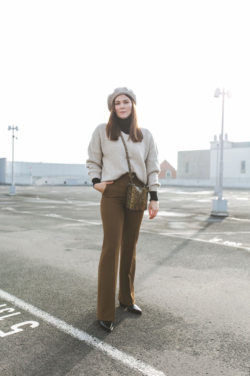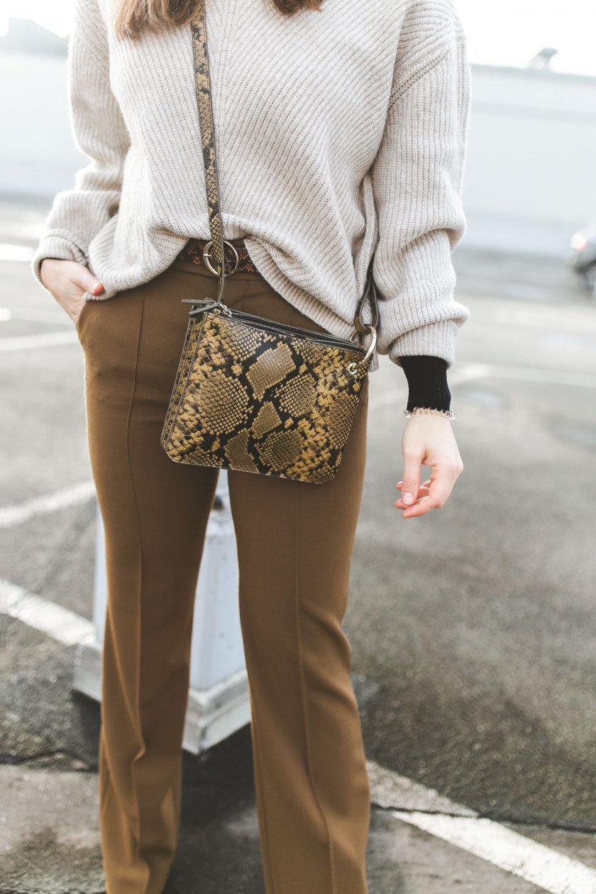 Der Eyecatcher in meinem heutigen Outfit sind definitiv Tasche und Gürtel in einem Animal-Print. Diese verleihen den sonst relativ schlichten Look etwas mehr Pep und lassen ihn interessant wirken. Neben der braunen Bundfaltenhose, in die ich übrigens von Minute eins an verliebt war, steht der Strickpullover in einem weiten Oversize-Schnitt im Mittelpunkt. Ich liebe diese Art von Pullover über alles. Sie halten nicht nur warm, sondern dorngraden elegante Styles auf eine schlichte aber schöne Weise.