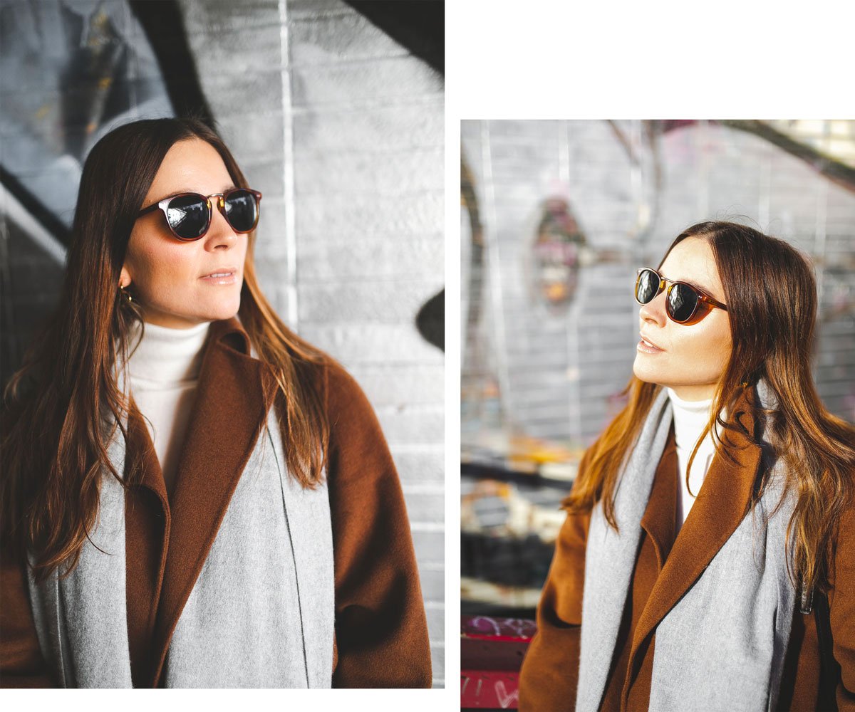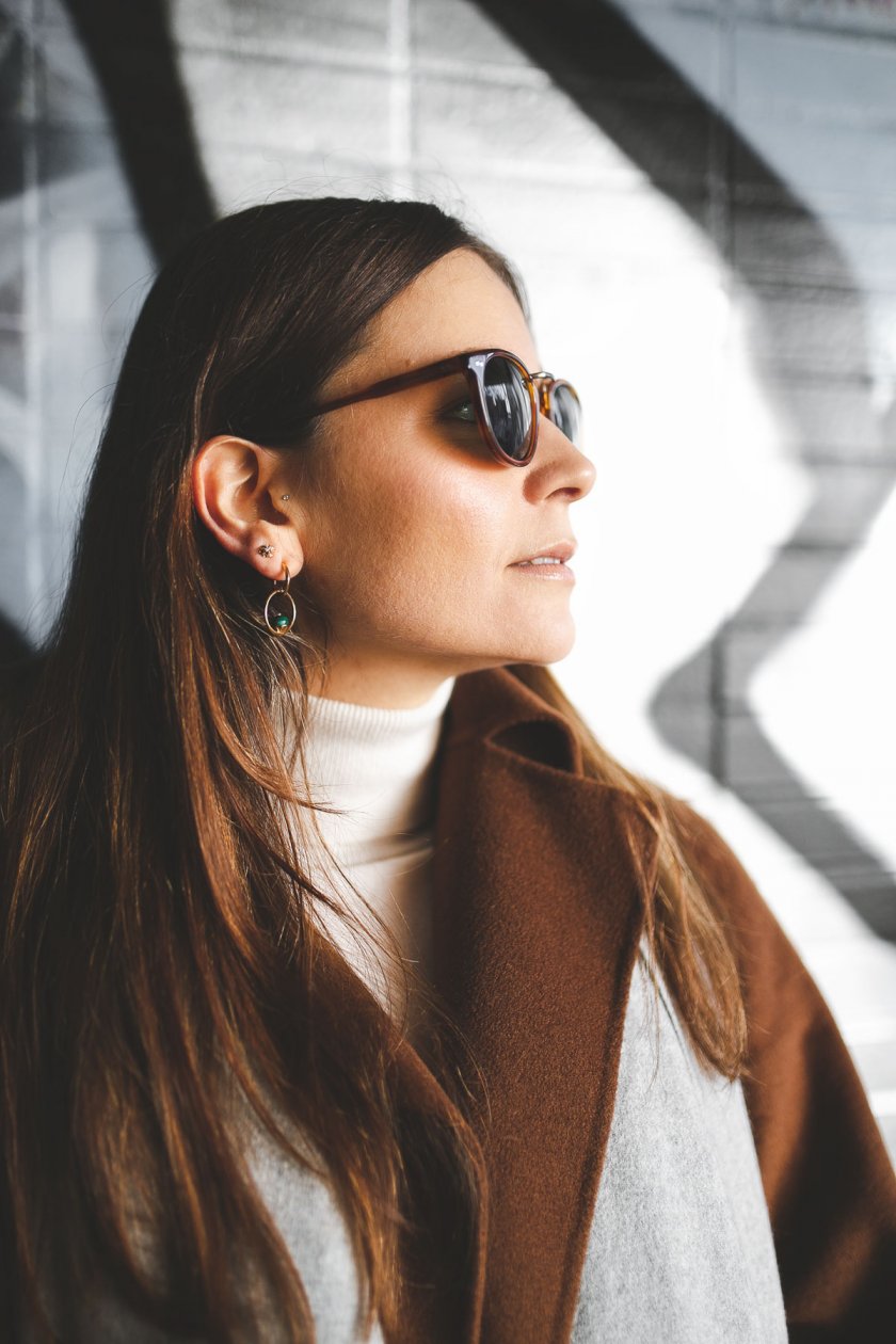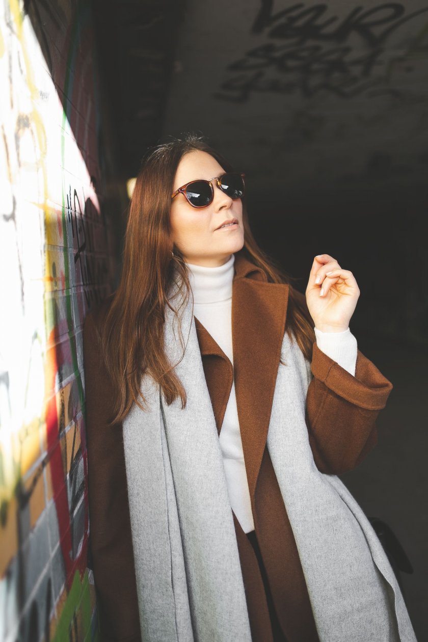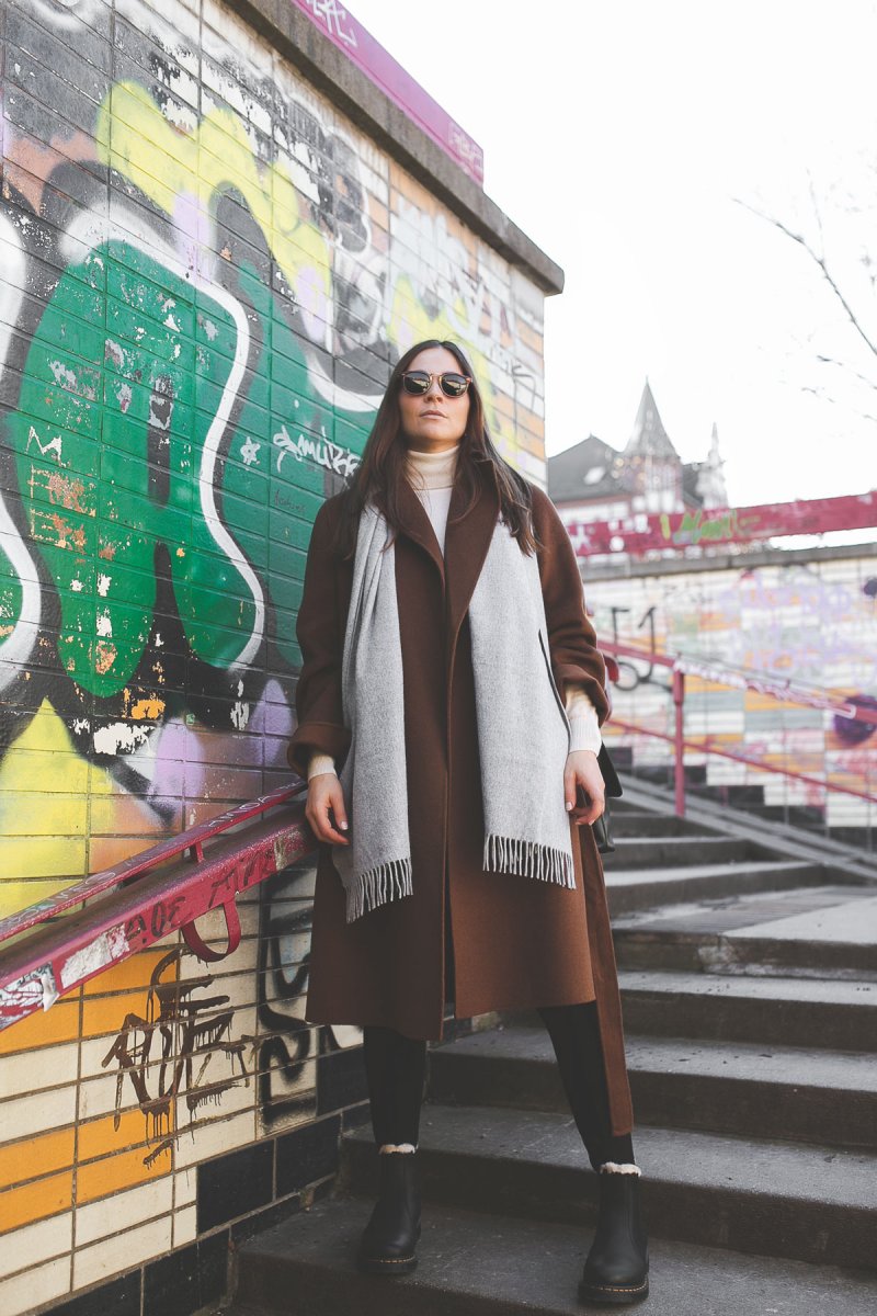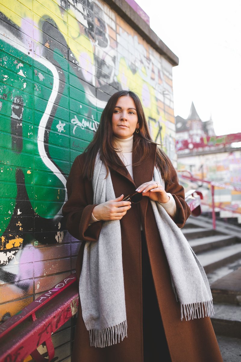 Kombiniert habe ich den Schuh zu einem minimalistisch-zeitlosen Style. Wieder einmal mit von der Partie ist mein brauner Mantel, den ihr bereits aus einigen Outfit Beiträgen kennt. Kombiniert habe ich den schönen Mantel mit einem weißen Rollkragenpullover aus Chasmere. Ich mag das Material im Winter so gerne, weil es trotz seiner Leichtigkeit einfach so warm hält. Für zusätzliche Wärme sorgt mein grauer Schal von COS, den ich mir letzten Winter in Berlin gekauft habe. Dieser Schal ist einfach superweich und rundet den Everyday Style auf eine gekonnte Weise ab.