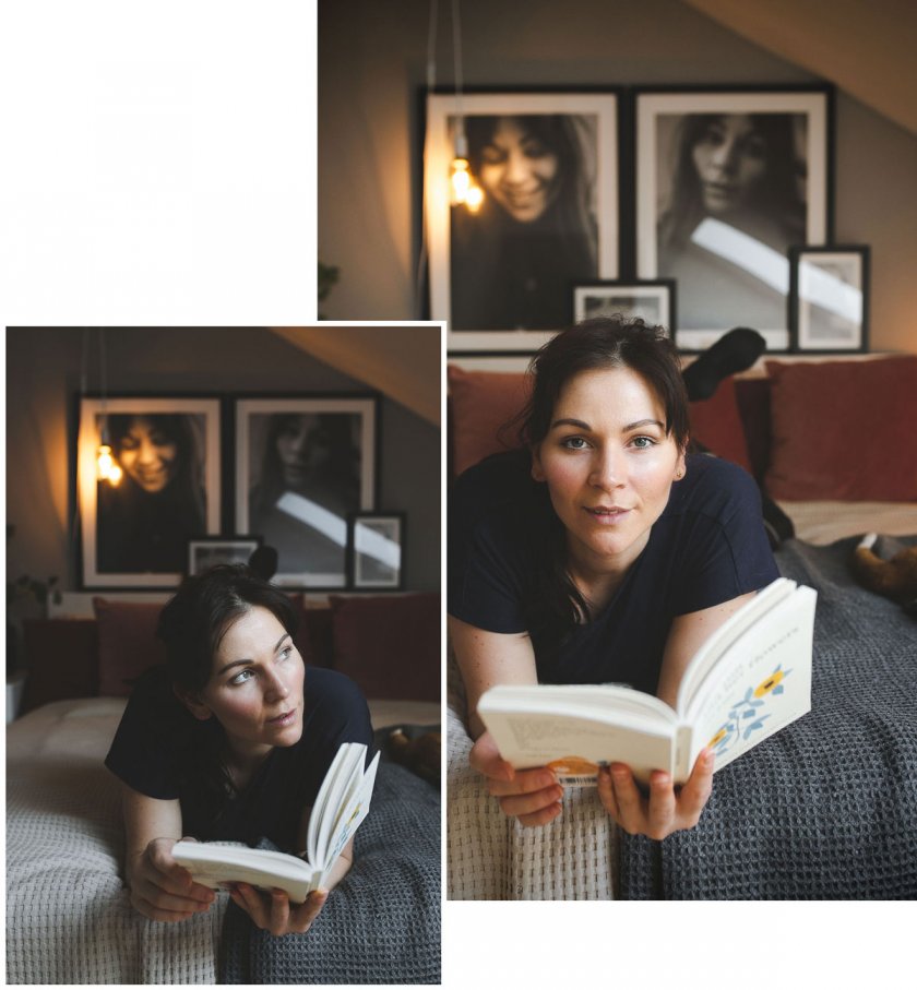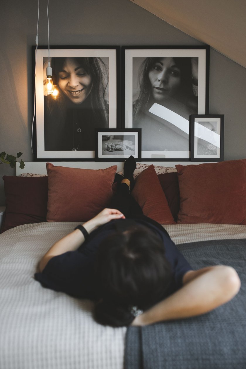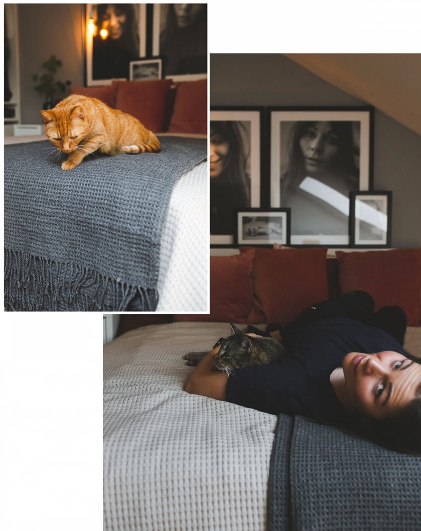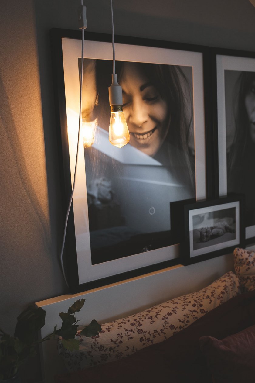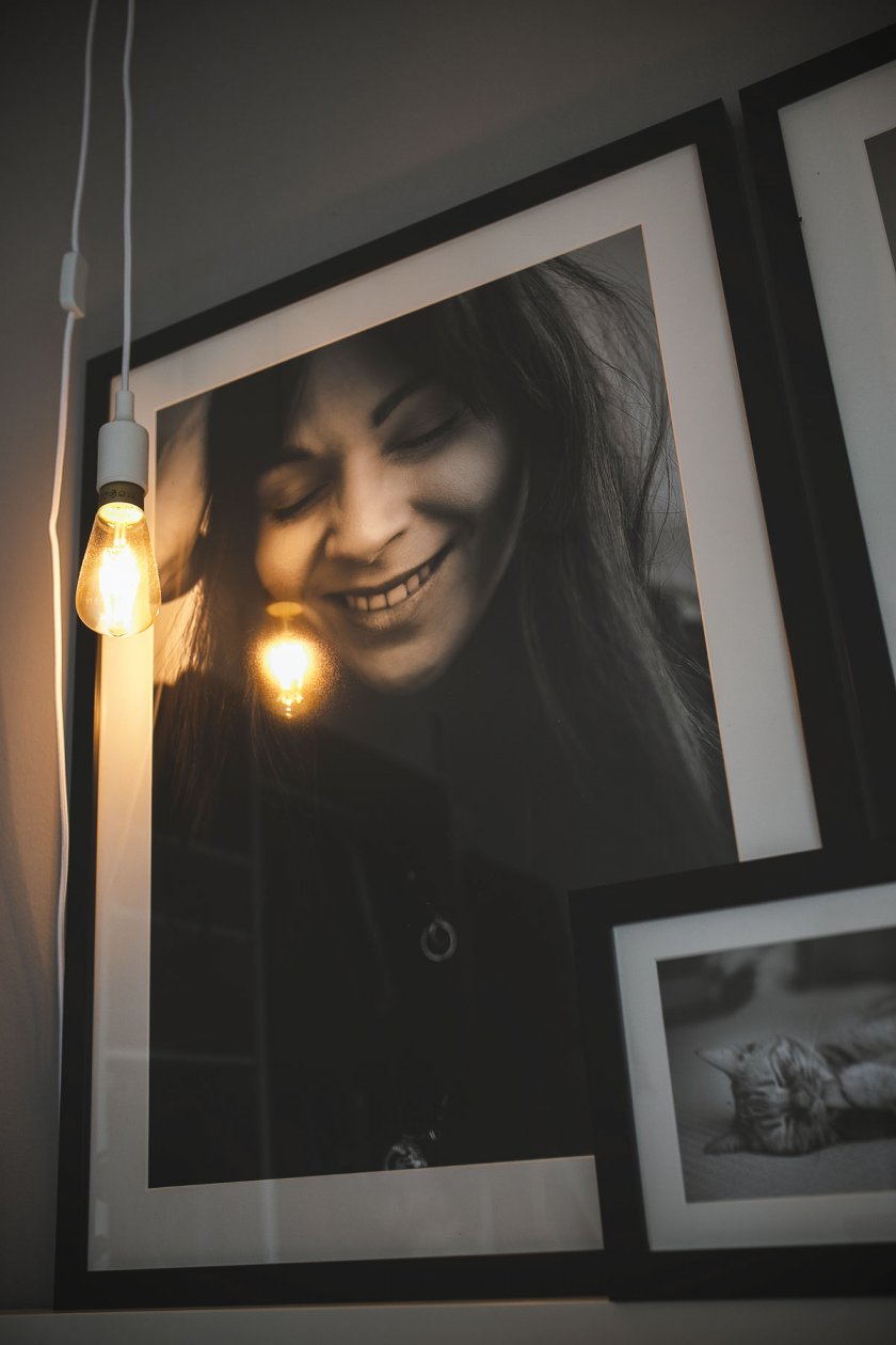 Ich wollte eine Fotowand mit Erinnerungen gestalten, auf der meine Katzen Lillie und Lenny und ein paar Selbstporträts von mit platz finden. Also habe ich wild darauf los geshootet und mit Licht und Schatten gespielt. Im Vorfeld war mir schon klar, dass ich die Fotos in schwarz-weiß an die Wand bringen möchte. Schwarz-weiß Aufnahmen sind ein wundervolles Stilmittel in der Fotografie und haben viel mehr Ausdrucksstärke als Farbfotos. Dementsprechend, wollte ich die Fotografien auch gerahmt haben. Ich habe nicht lange überlegt und mich für einen schwarzen Rahmen entschieden.