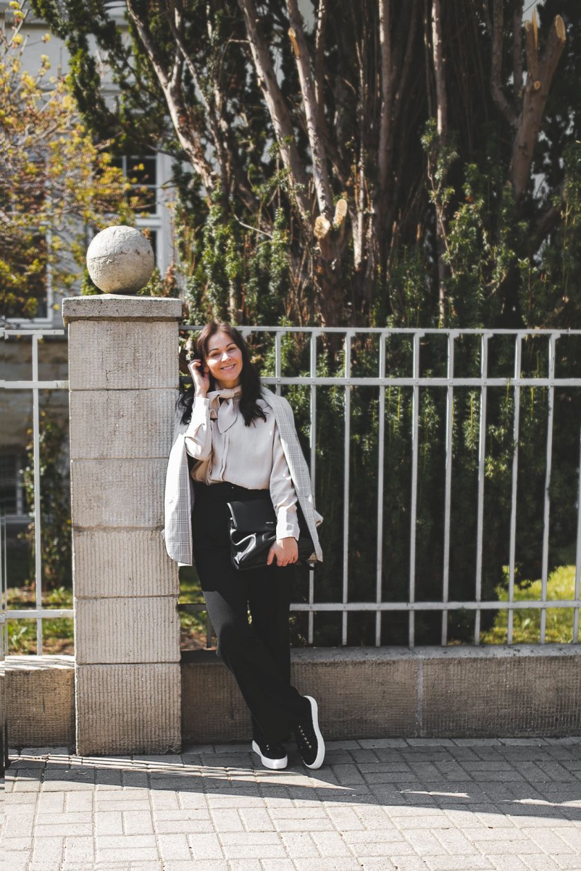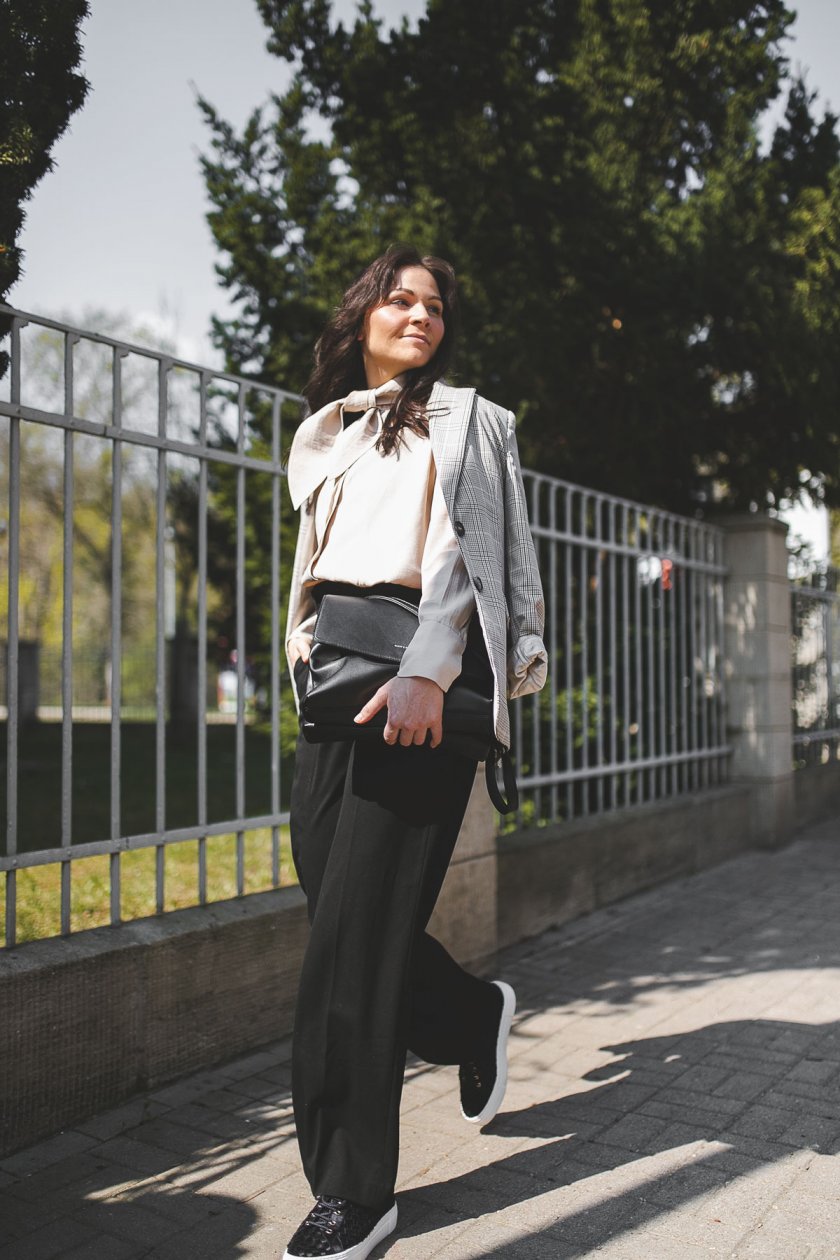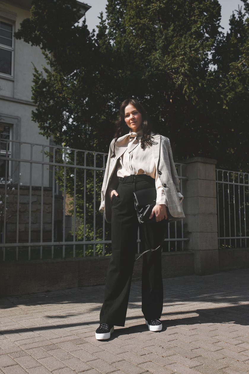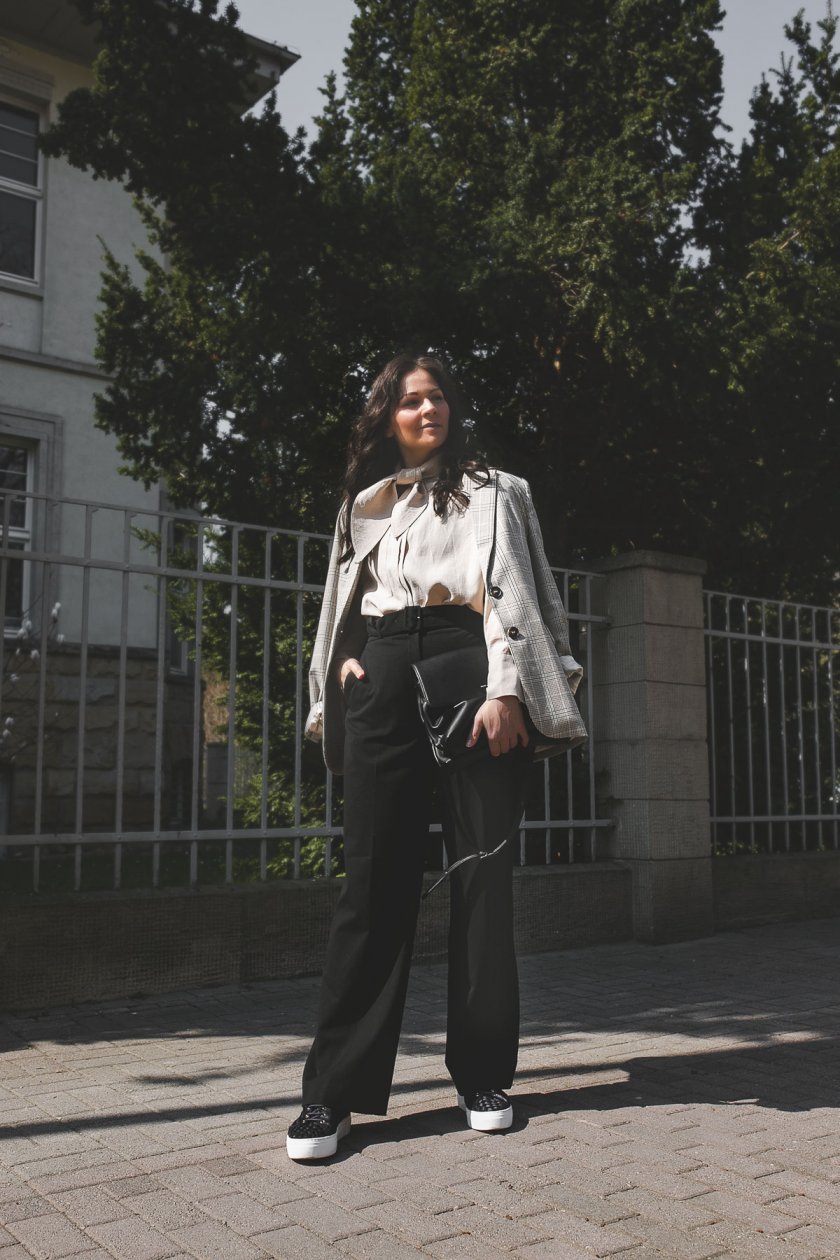 schwarze Marlene-Hose / schwarze Tasche / beige Schleifen-Bluse / karierter Blazer / schwarze Sneakers