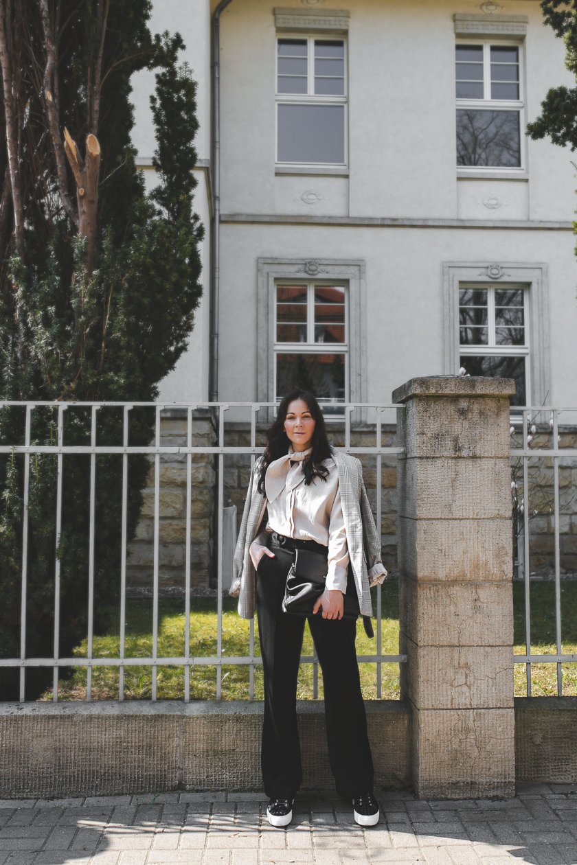 Wie ich den Frühling liebe! Ich mag das Gefühl von warmen Sonnenstrahlen auf der Haut und endlosen Spaziergängen im Grünen – natürlich im entsprechenden Outfit. Elegant soll es sein und einen Hauch sportiven Spirit versprühen. Ich würde sagen, das ist mir mit diesem Frühlings Outfit mit Schleifenbluse, AGL Sneakers und kariertem Blazer sehr gut gelungen. Was meint ihr?
