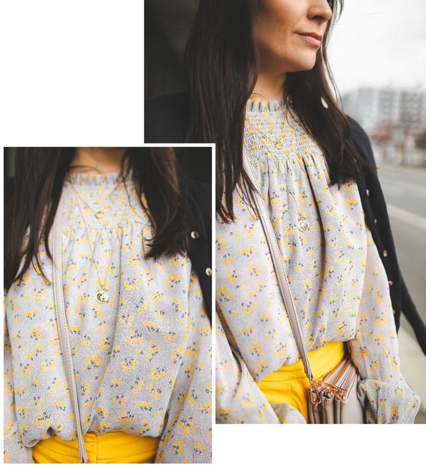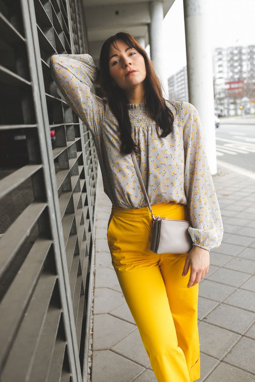 Zu der sehr auffälligen Hose setzte ich bei dem Oberteil eher auf Zurückhaltung. Ich habe eine Bluse mit zartem Blumenmuster gewählt und die gelbe Farbe wird in diesem Muster dezent aufgegriffen. Dieses Oberteil besticht nicht nur durch ihren tollen Schnitt, sondern auch durch das dezente Frühlingsmuster.