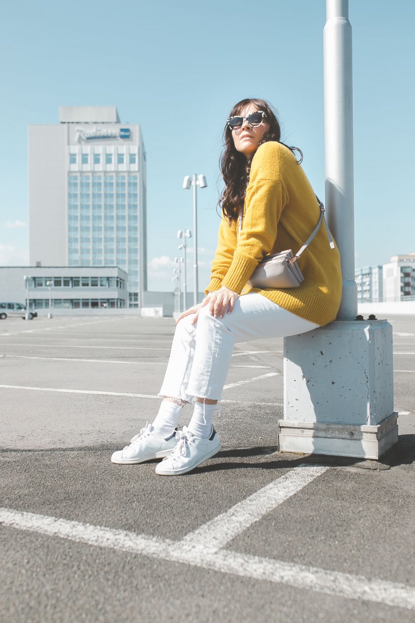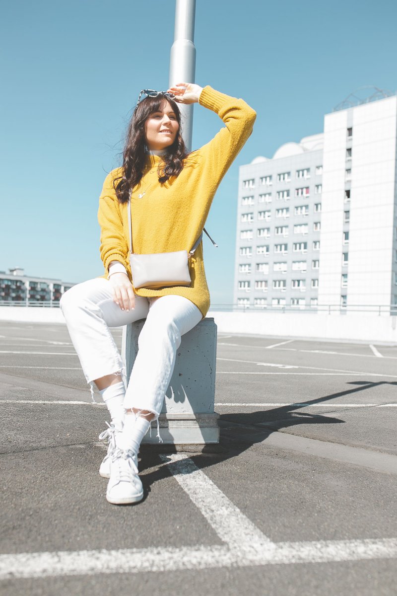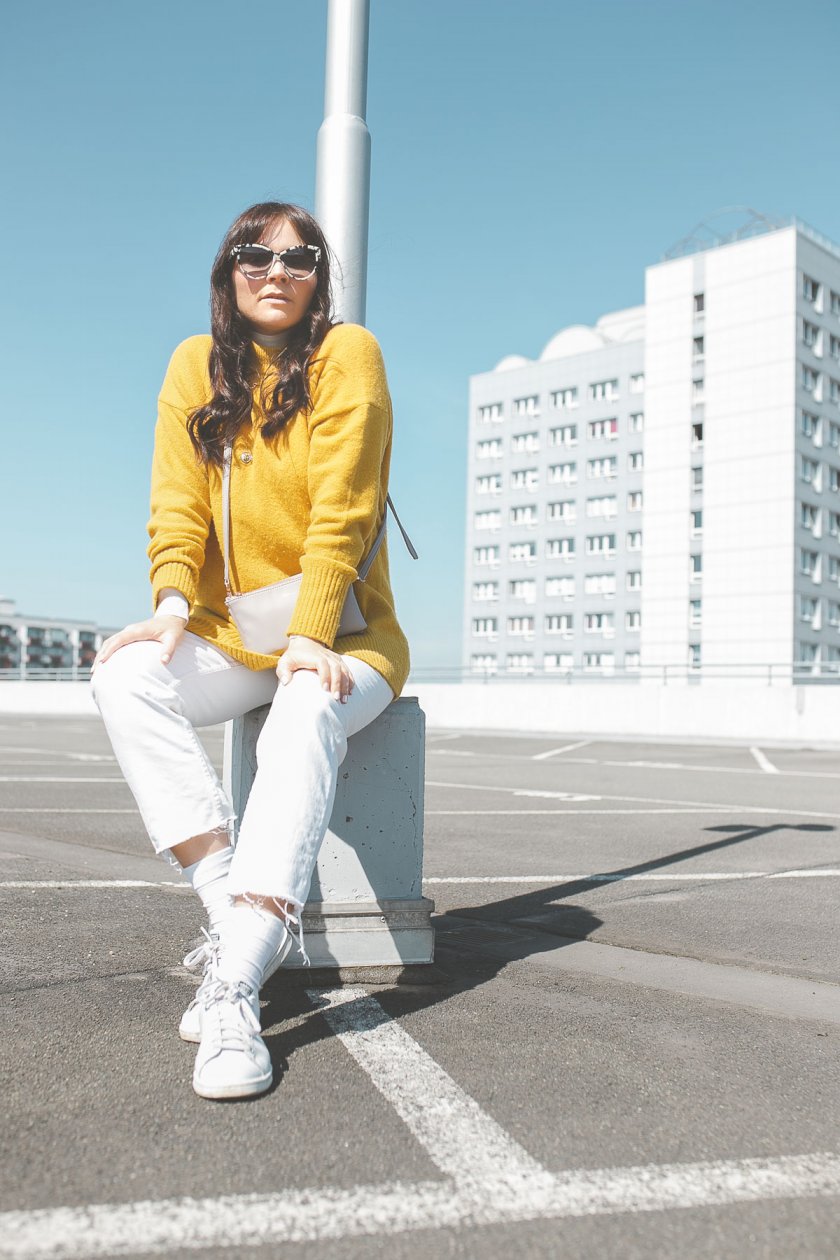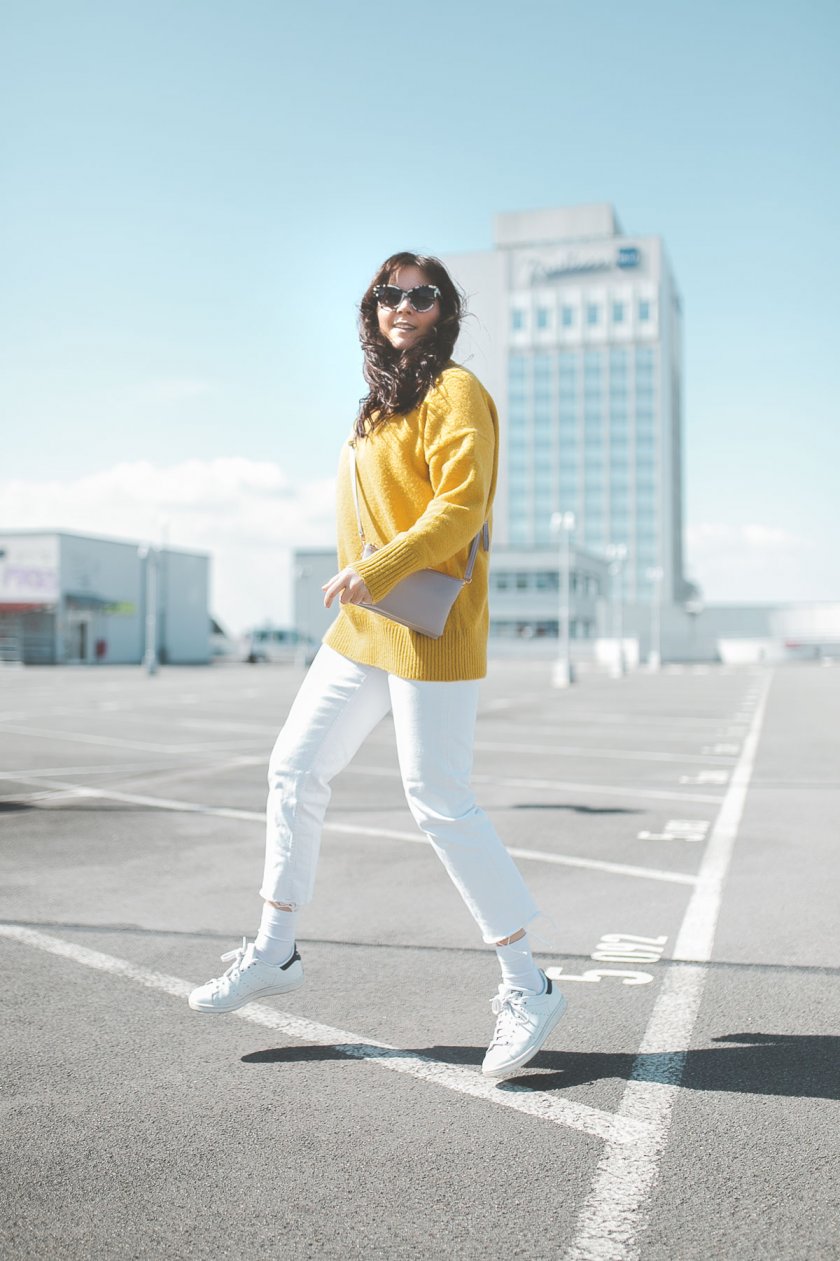Knallige Farben stehen bei mir hoch im Kurs, das muss wohl an dem tollen Sonnenwetter der letzten Wochen liegen. Ein ständiger Begleiter in dieser Zeit ist mein gelber Pullover. Ich habe ihn so oft in den letzten Wochen ausgeführt, dass ich schon fast in ihm wohne. In meinem heutigen Look kombiniere ich ihn mit einer weißen Jeans – die perfekte Kombi für den Frühling. Findet ihr nicht auch? Um den Style noch etwas sportlicher zu gestalten, trage ich den Pullover mit weißen Sneakers aus. Ich liebe es, in meinen Outfits eine gewisse sportliche Note einzubringen.