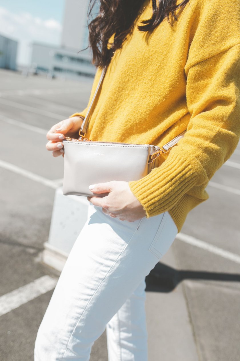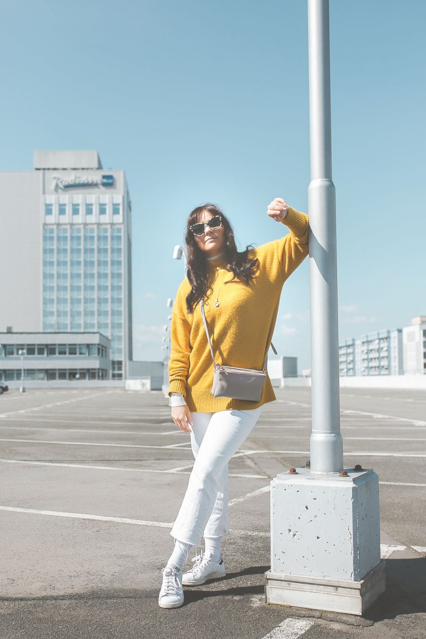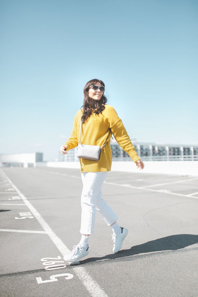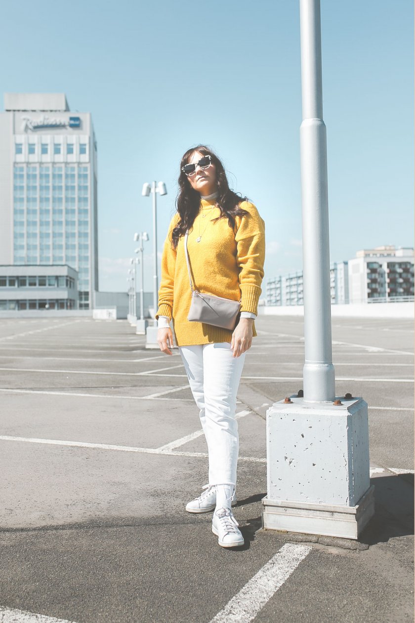 Knallige Farben stehen bei mir hoch im Kurs, das muss wohl an dem tollen Sonnenwetter der letzten Wochen liegen. Ein ständiger Begleiter in dieser Zeit ist mein gelber Pullover. Ich habe ihn so oft in den letzten Wochen ausgeführt, dass ich schon fast in ihm wohne. In meinem heutigen Look kombiniere ich ihn mit einer weißen Jeans – die perfekte Kombi für den Frühling. Findet ihr nicht auch? Um den Style noch etwas sportlicher zu gestalten, trage ich den Pullover mit weißen Sneakers aus. Ich liebe es, in meinen Outfits eine gewisse sportliche Note einzubringen.