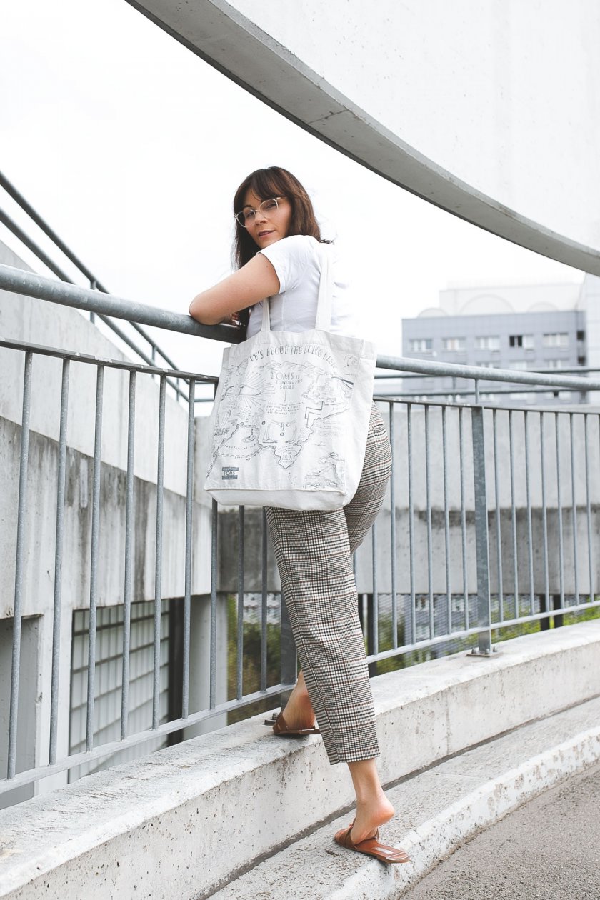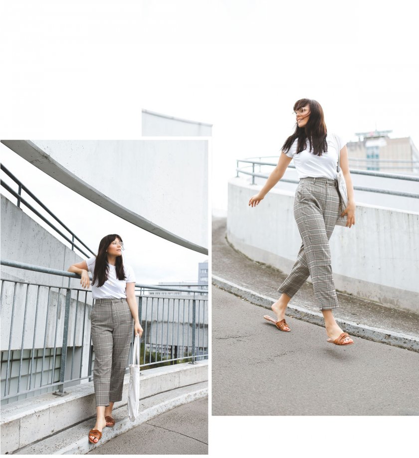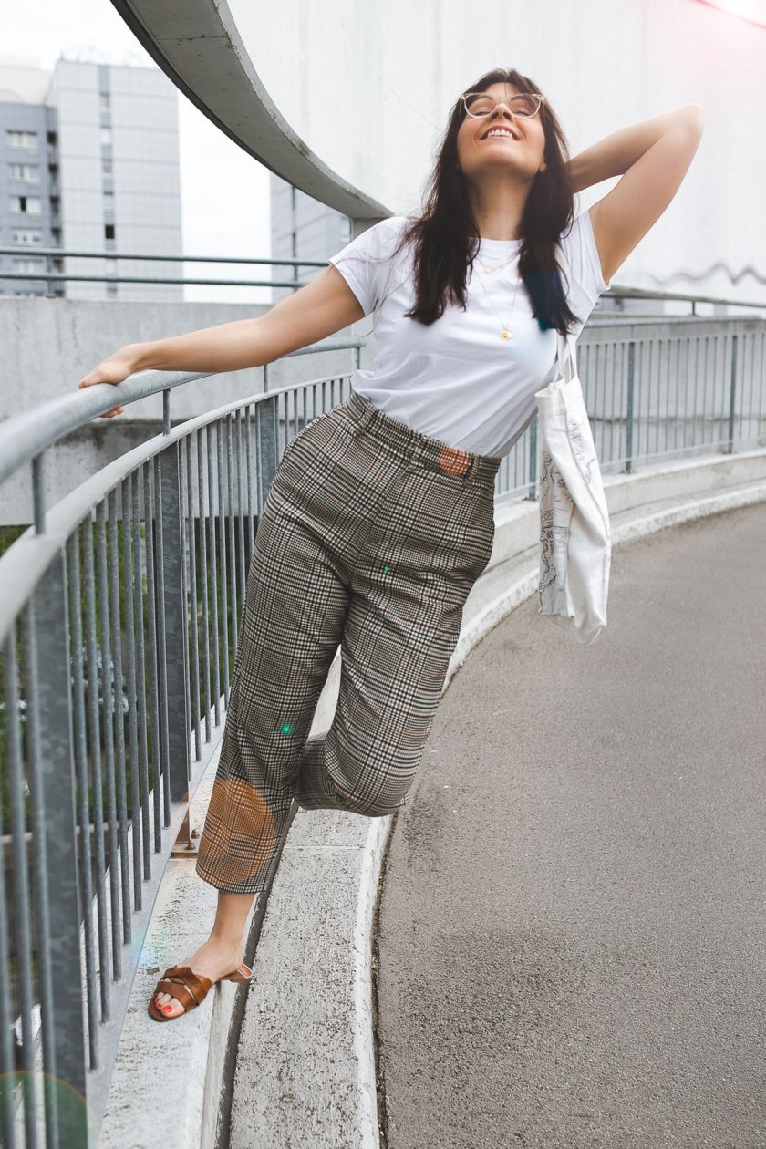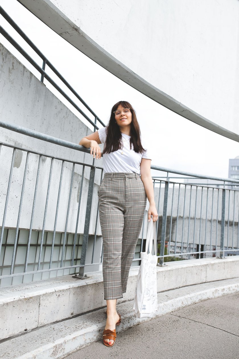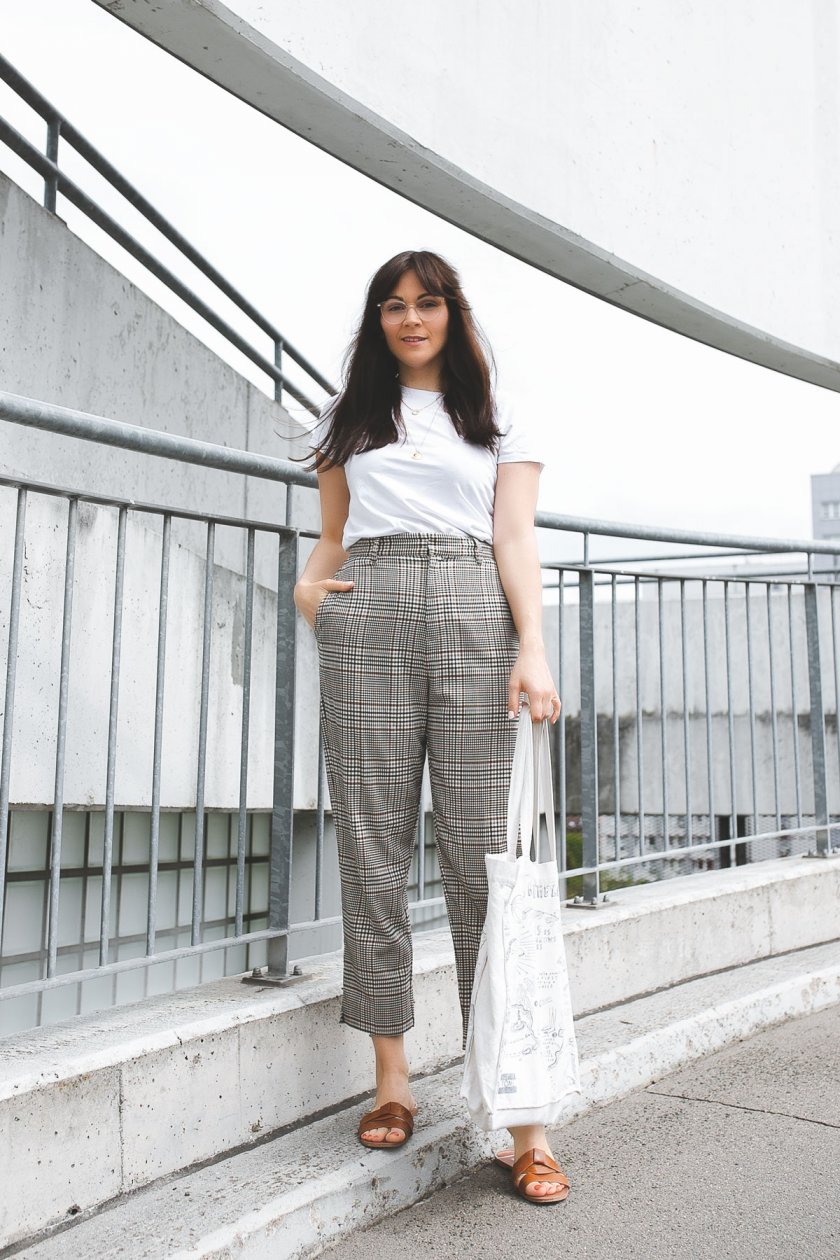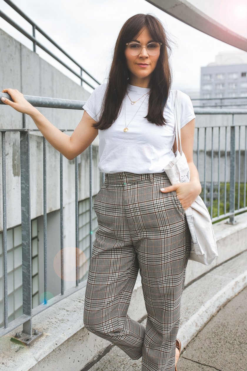 Casual Frühlingsoutfit mit VIU The Honest Brille, karierter Hose und Basic Shirt: Modetrend 2019 zum Nachshoppen!