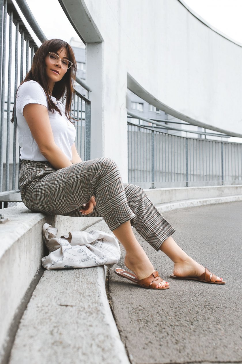 weißes T-Shirt / karierte Hose / braune Sandalen / Brille VIU