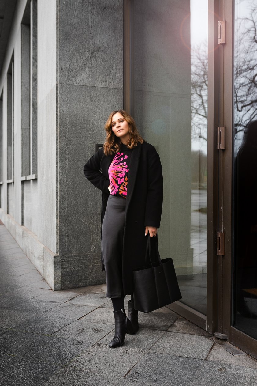 In meinem heutigen Winter Outfit kombiniere ich den eleganten Midirock zu einem auffälligen Strickpullover. Ich bin ein großer Fan vom Mixen unterschiedlicher Materialien und dieser Look bietet dafür sehr viel Spielraum. Abgerundet wird der Style mit einem gemütlichen schwarzen Mantel, der das Rock Outfit gleichzeitig winterfest macht. Wieder mit dabei sind meine schwarzen Boots sowie die neue schwarze Tasche von Matt & Nat, die auf den Namen HYDE getauft wurde. Beides sind zeitlose Basics, die sich im Alltag zu jedem Style austragen lassen.