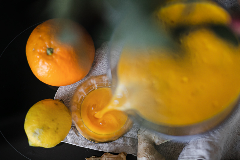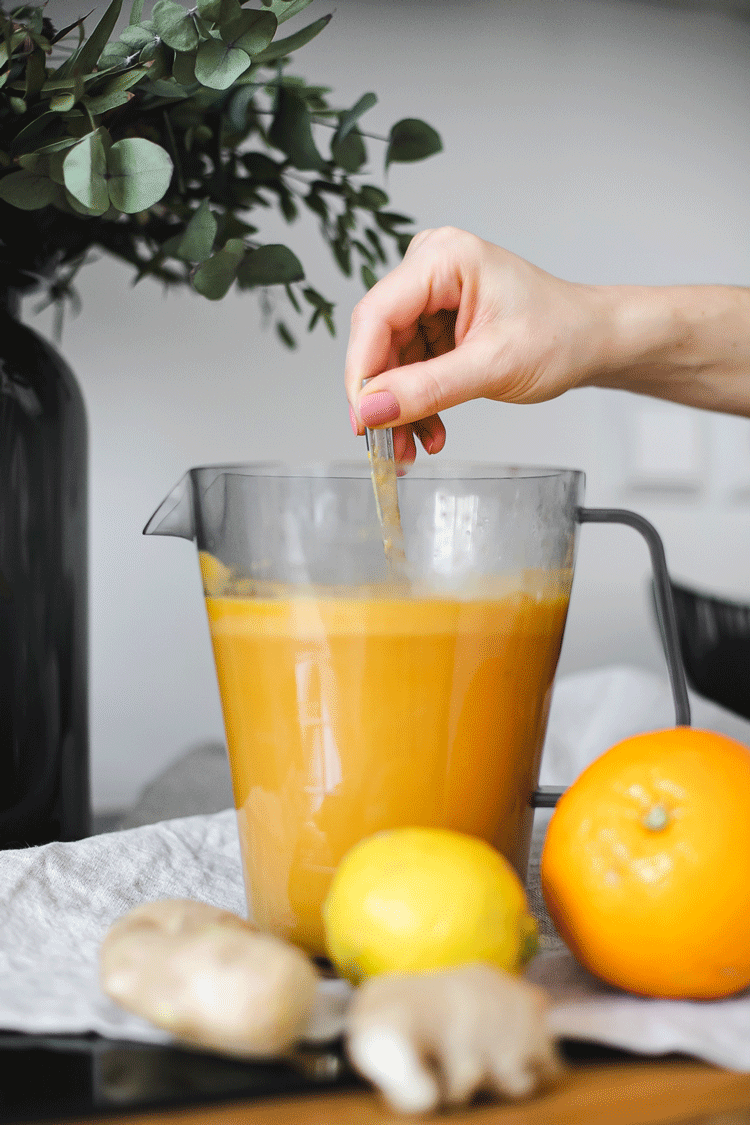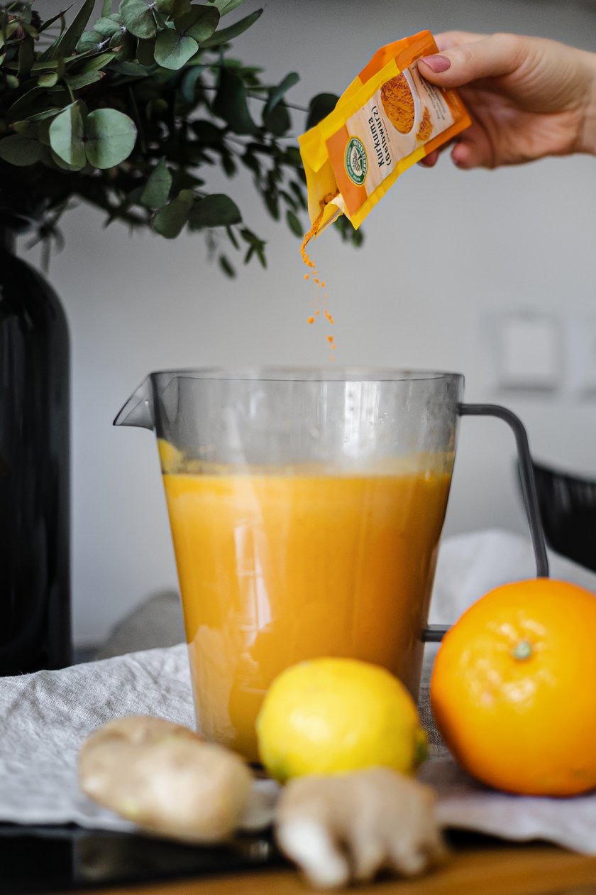Zubereitung des Ingwer-Kurkuma-Shots mit Apfel, Orange und Zitrone