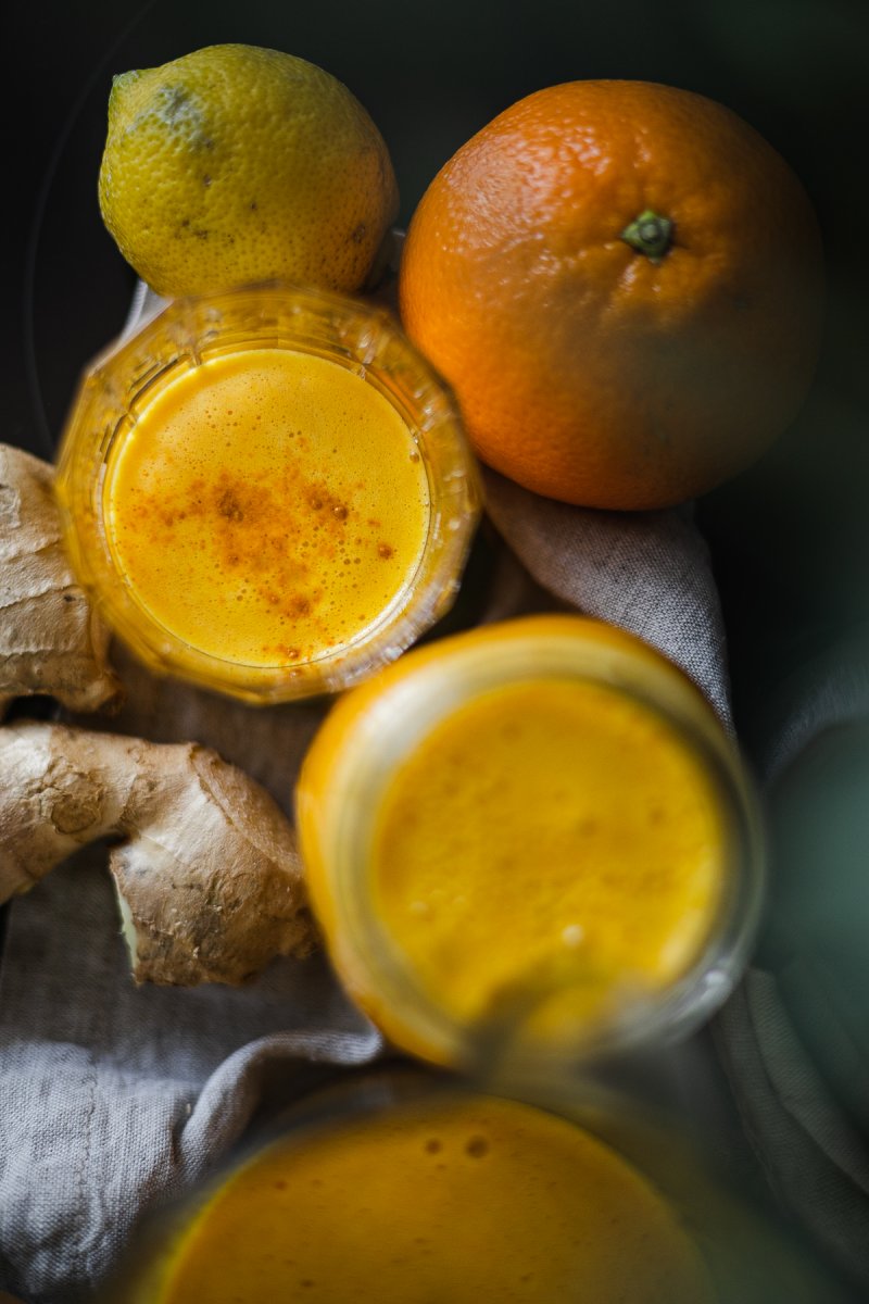 Zutaten für den Ingwer-Kurkuma-Shot mit Apfel, Orange und Zitrone