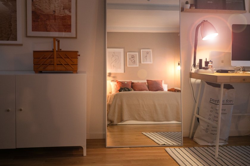 Der große Spiegel neben meinem Schreibtisch, ist in den letzten Monaten vor meinem Umzug bei mir eingezogen. Ich liebe dieses Modell, vor allem auch, weil man es super gegen die Wand lehnen kann. Er verleiht den Raum eine gewisse Tiefe, macht ihn größer und gemütlicher.