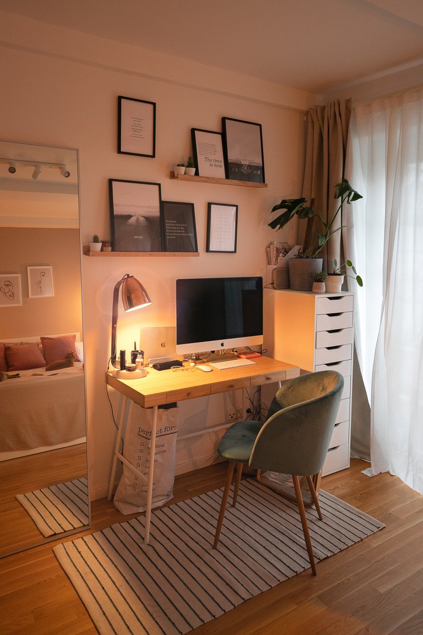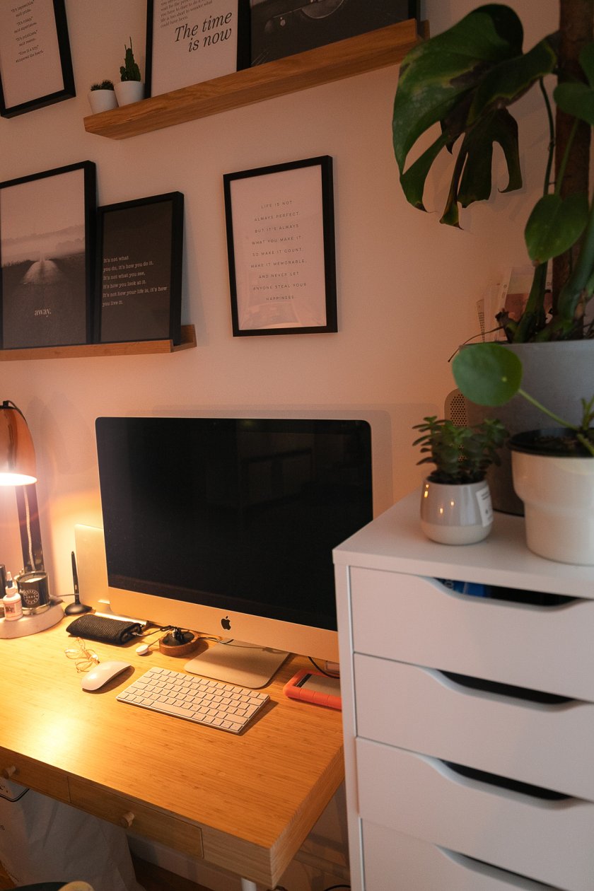 Gegenüber von meinem Schlafbereich hat sich mein kleiner Arbeitsbereich eingefunden. Da ich in einem externen Office arbeite, genügt mir dieser kleine Bereich, um für ein paar Stunden in der Woche von hier aus zu arbeiten. Als Schreibtisch habe ich meinen ehemaligen Schminktisch umfunktioniert, da mein alter Schreibtisch viel zu groß ist, um ihn an dieser Stelle nutzen zu können. Dieser lebt mittlerweile als Esstisch in meinem Wohnbereich – wo er einfach perfekt passt. Neben meinem Schreibtisch habe ich noch einen kleinen Container, in dem ich diverse Büromaterialien verstaut habe, sowie einige Schminkutensilien. Ich bin ein großer Fan von Clean-Living und habe meinen Kleinkram gerne verstaut, am liebstenunsichtbar in Schubladen und Schränken.