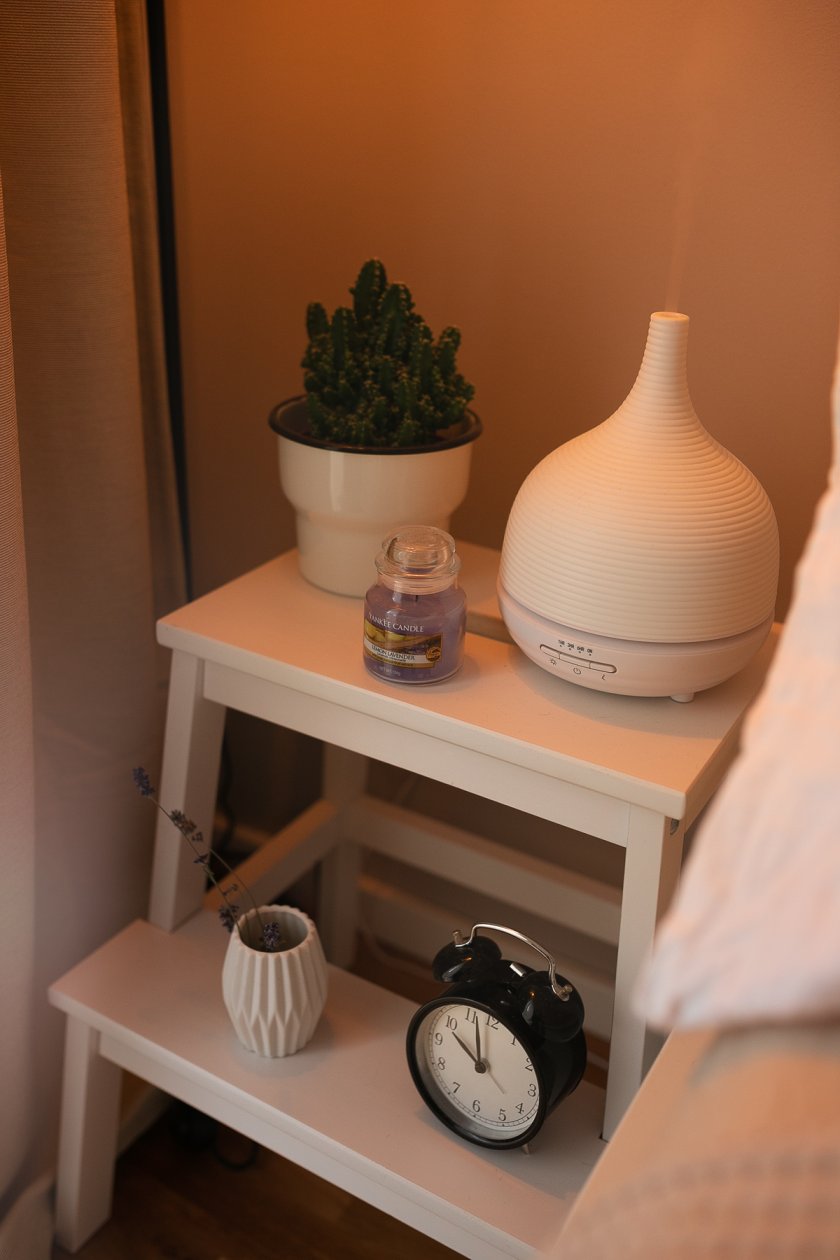 Links und rechts vom Bett habe ich mich für zwei weiße Nachttische entschieden – einer ist offen gestaltet, der andere geschlossen mit jeder Menge Stauraum. Auf beiden finden einige Dekorationselemente ihren Platz, die meinen Schlafbereich noch wohnlicher machen. Dabei helfen unter anderem auch die Bilder, die über meinem Bett ihren Platz gefunden haben.