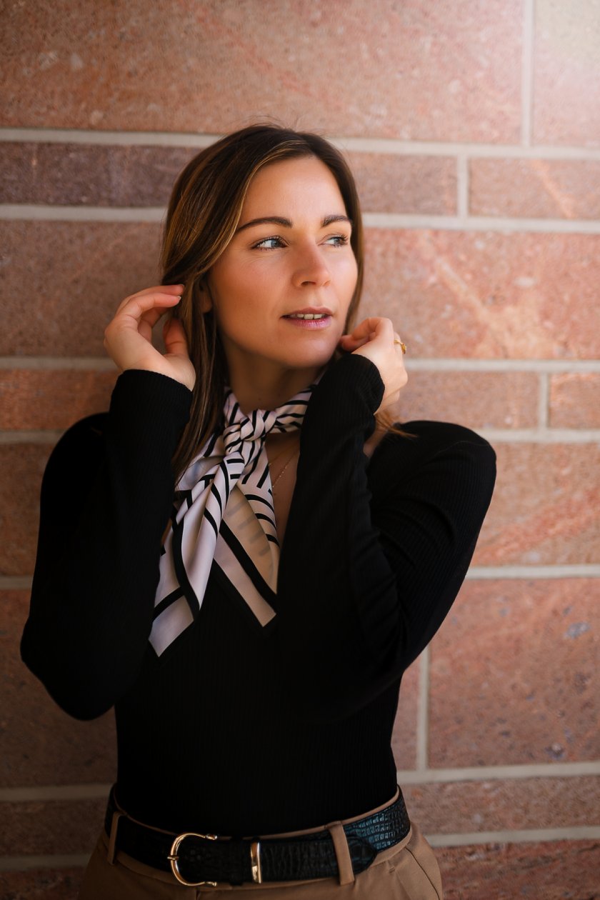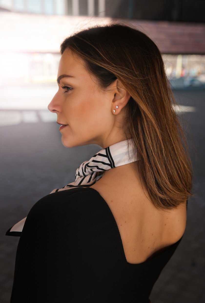 Der schwarze Blazer rundet den Look ab und verleiht ihm eine gewisse Coolness. Dazu trage ich schwarze Boots, die sich einfach zu jedem Outfit gut stylen lassen. Abgerundet wird mein heutiger Look mit einem Halstuch und einer schwarzen Tasche.