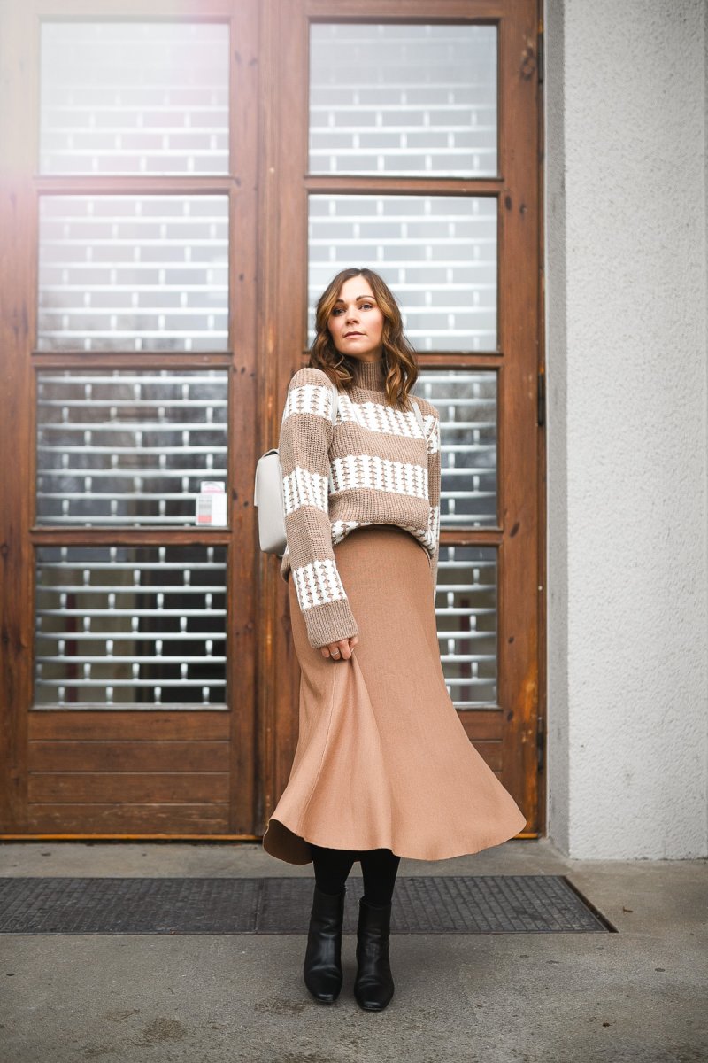 Midiröcke mag ich super gerne. Wer diesen Modeblog schon etwas verfolgt, bekam schon einige Rock-Styles zu sehen. Mein Favorit aus dem letzten Jahr ist definitiv das Rock-Outfit mit DVF Tasche. In diesem Jahr starte ich die Midirock-Saison etwas früher. Dafür wähle ich ein Modell aus Strickstoff aus, das auch an kühleren Tagen standhält.