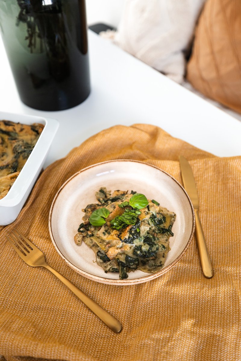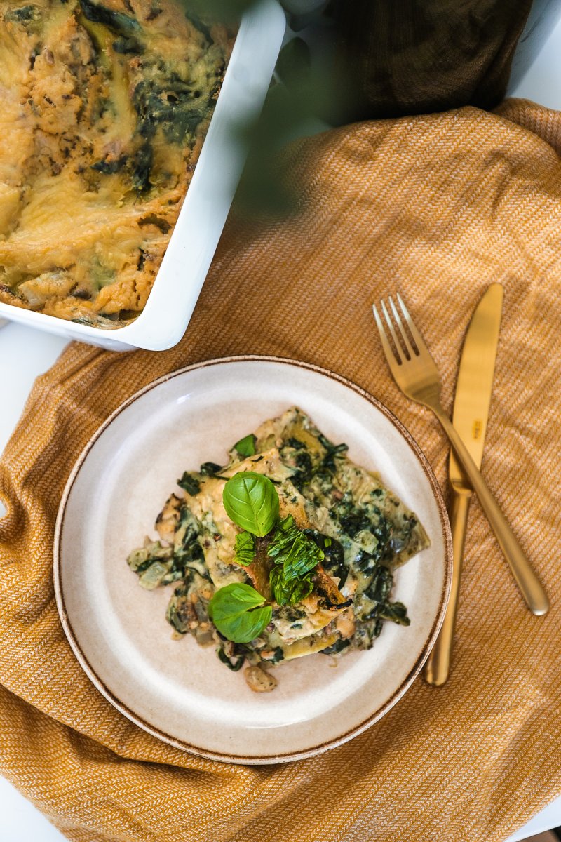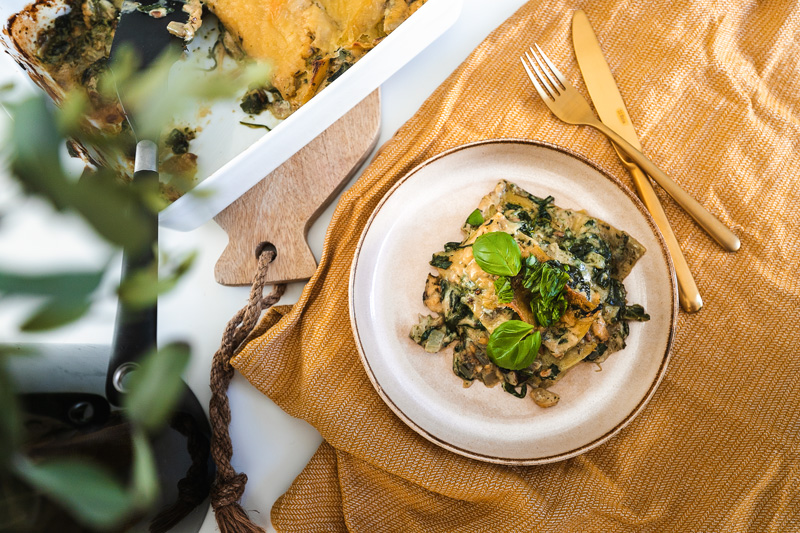 Zubereitung der veganen Mangold-Spinat-Lasagne mit Lasagneplatten aus grünen Linsen