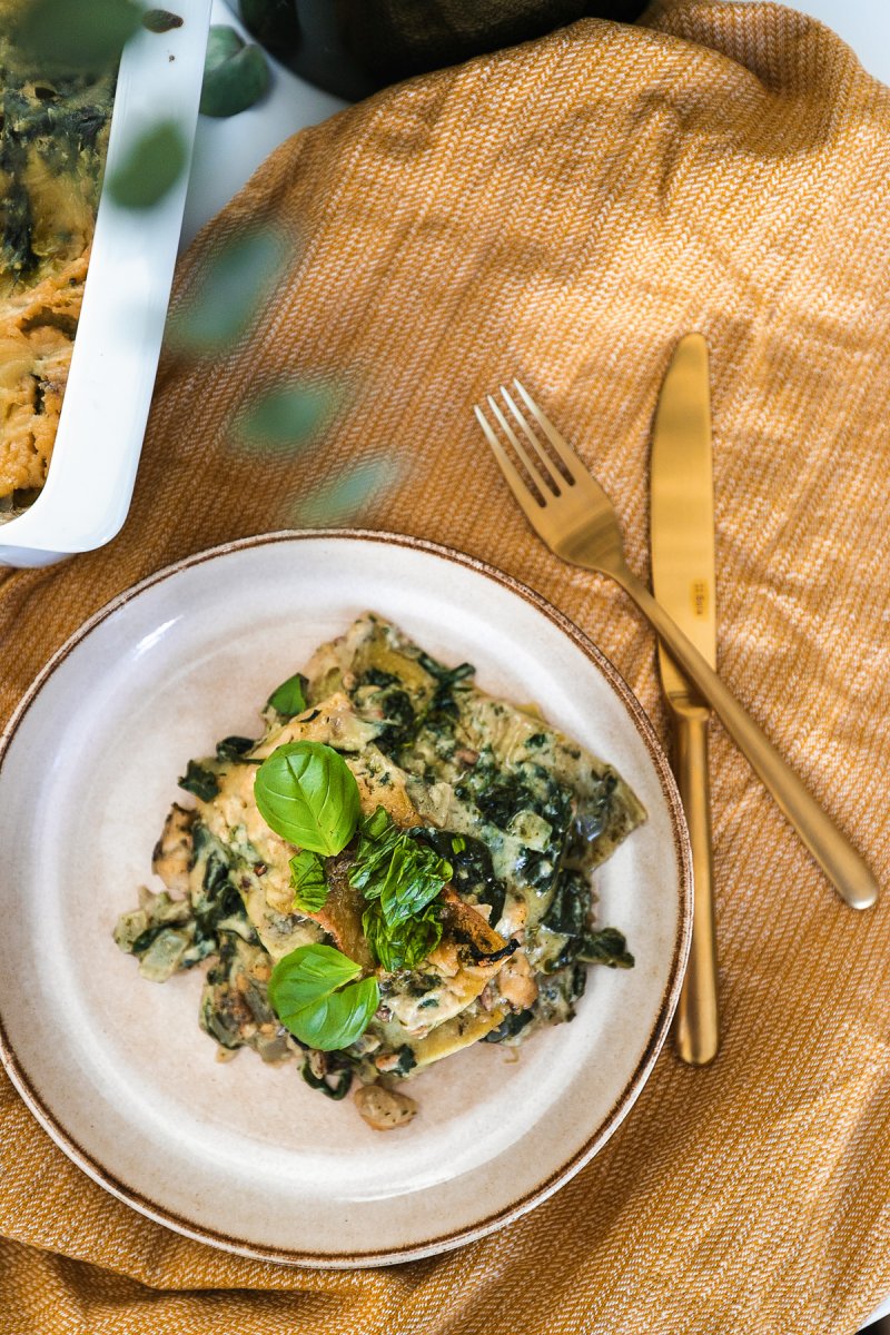 Die Lasagne mit frischem Basilikum garnieren und heiß servieren. Ich wünsche euch viel Spaß beim Nachkochen und Genießen der veganen Mangold-Spinat-Lasagne.