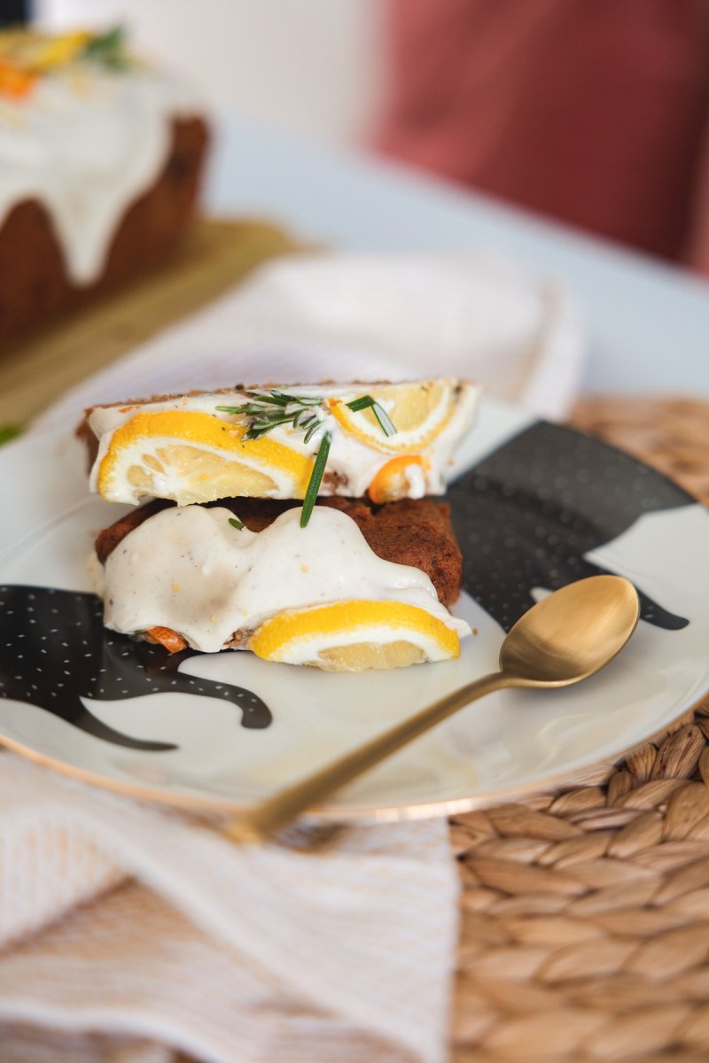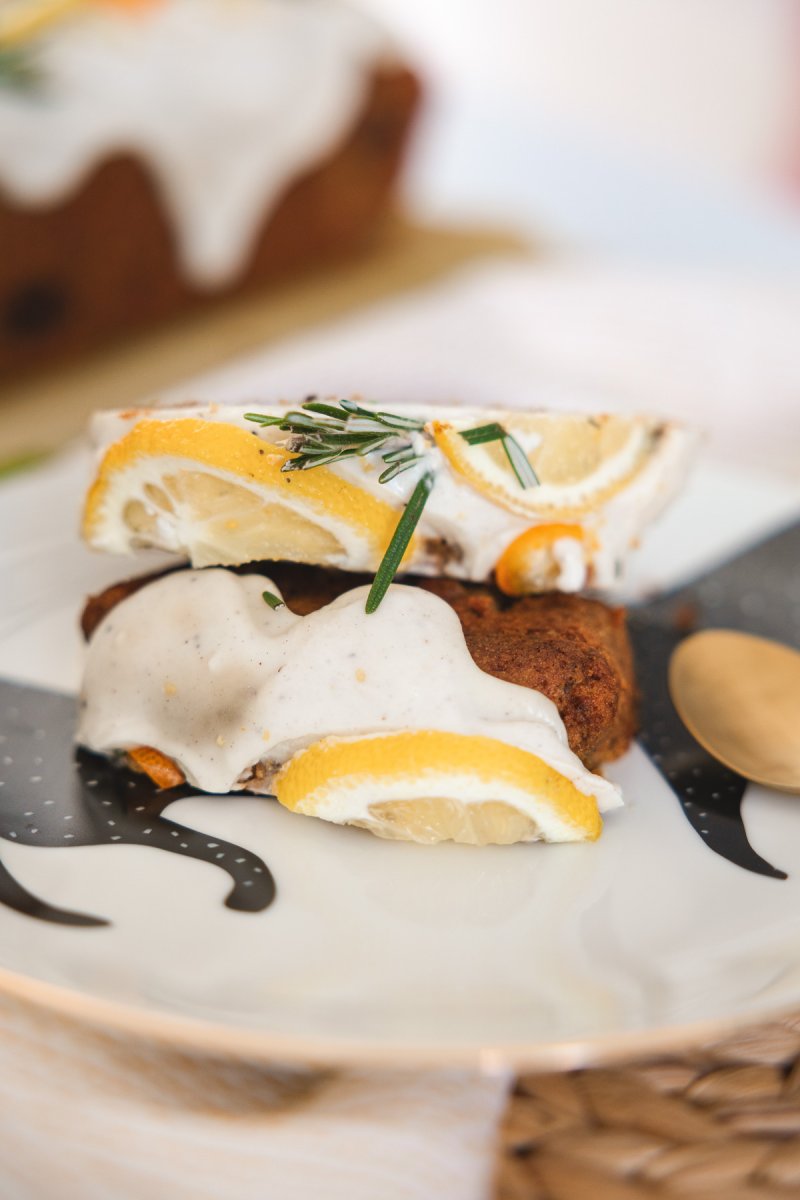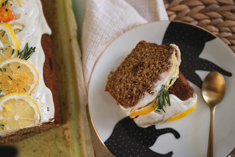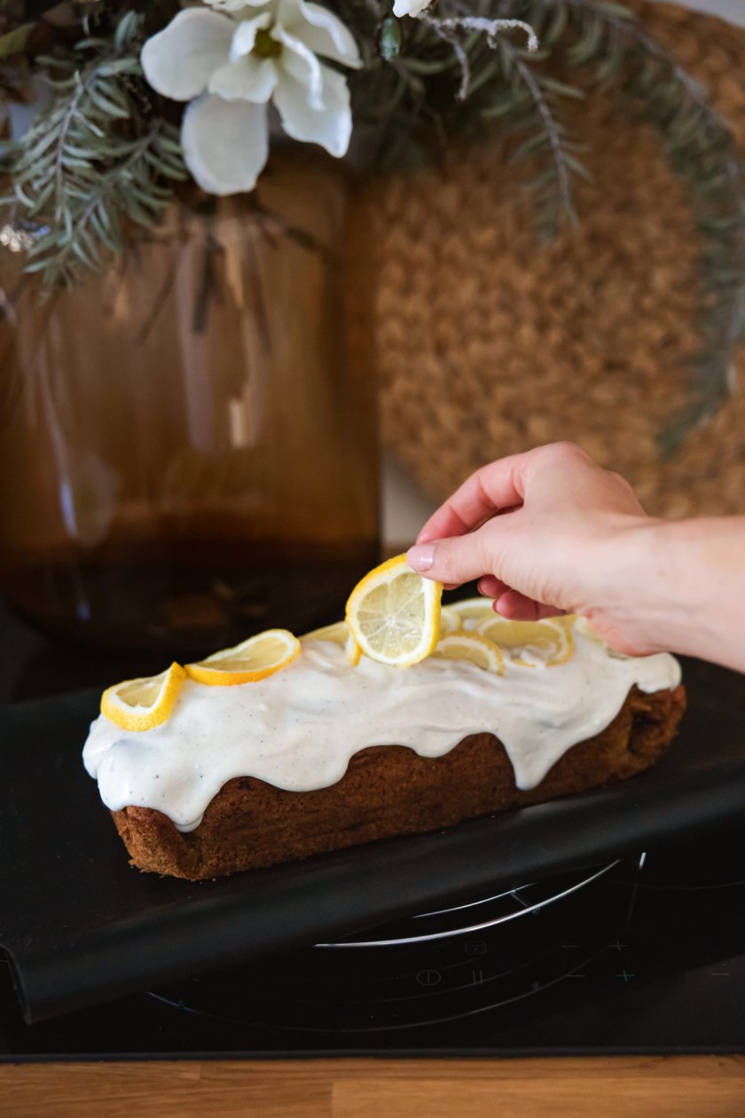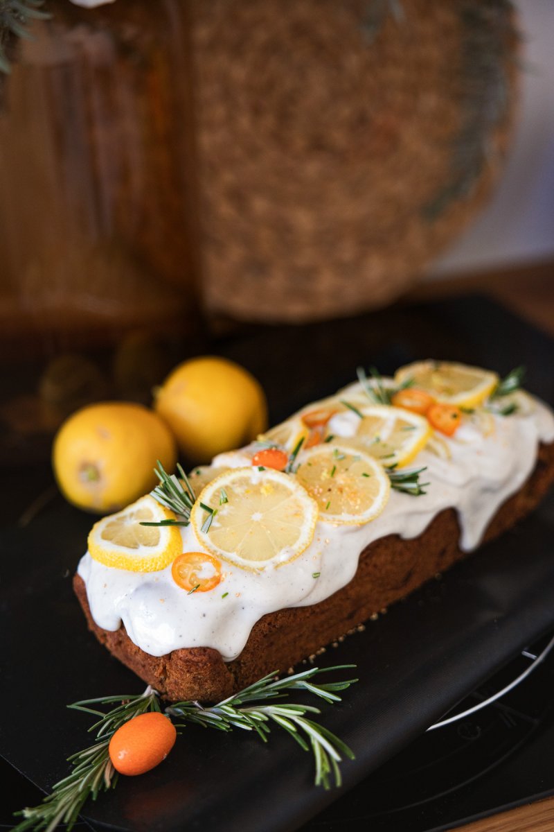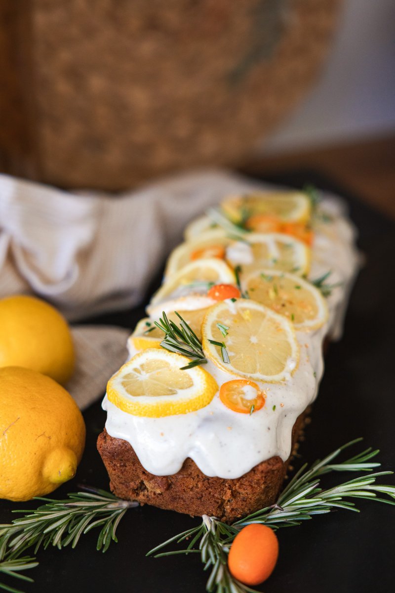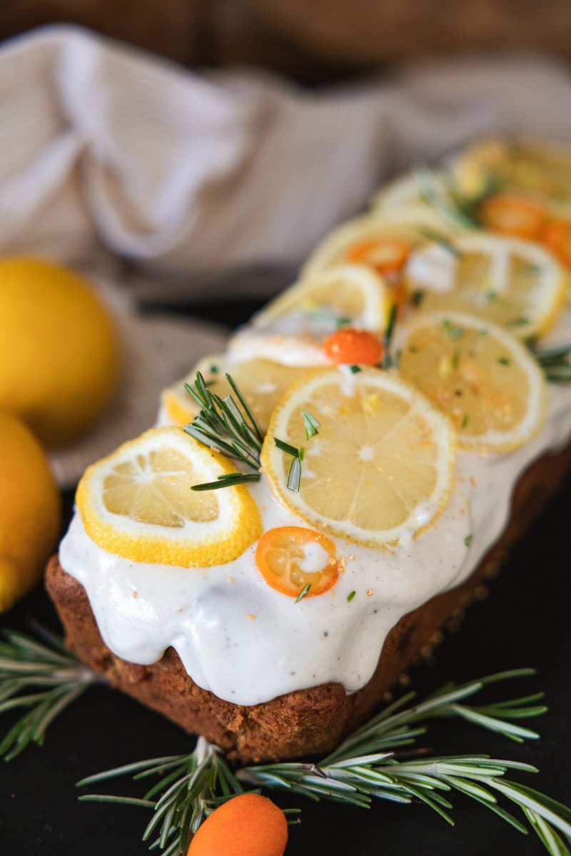 - Bei dem Topping meines veganen Zitronenkuchens habe ich mir kreativ ausgetobt. Ich habe mich für einen Mix aus Zitrone, Rosmarin und Kumquats entschieden. Die Zitrone sowie Kumquats habe ich in hauchdünne Stücken geschnitten und auf dem Kuchen platziert.