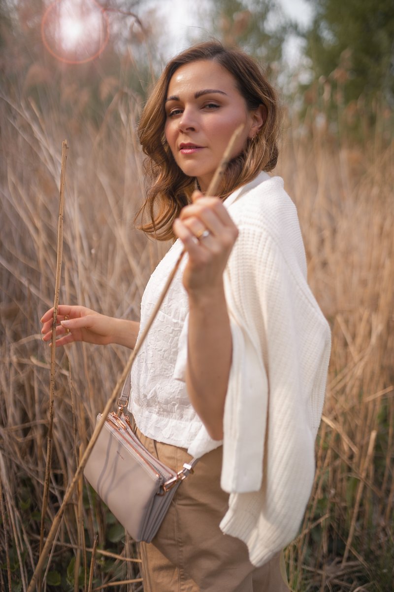 In meinem heutigen Outfit habe ich mich für einen Mix aus lässig und chic entschieden. Zu der leichten Stoffhose trage ich eine elegante weiße Bluse und Cardigan aus. Je nach Temperatur kann ich den Style anpassen und ihn mit oder ohne Cardigan ausführen. Über die Schultern habe ich mir meine geliebte Matt & Nat Tasche geworfen, die mich schon einige Jahre begleitet und den Look sehr gut ergänzt.