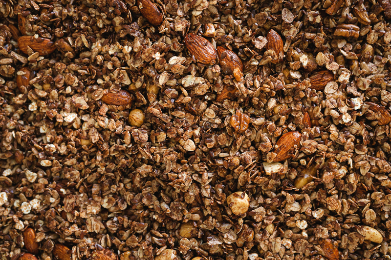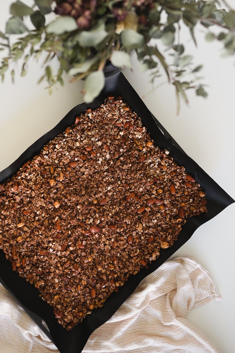 Zubereitung des veganen Schokoladen-Granolas + Joghurt mit gebratenem Pfirsich