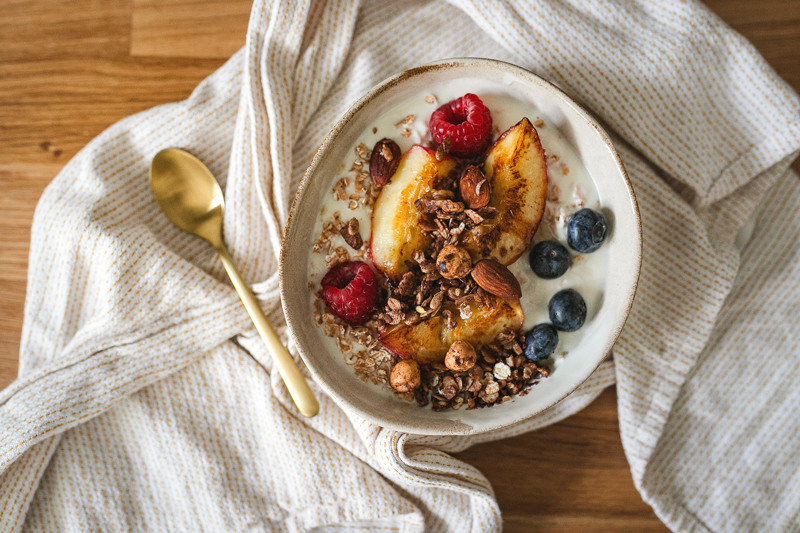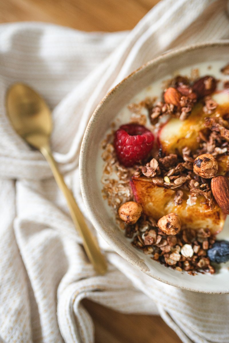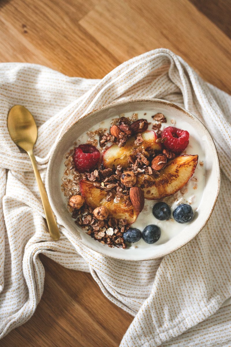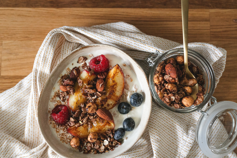 Ich bin ein Frühstücksmensch durch und durch. Eines meiner derzeit liebsten Frühstückssnacks ist Joghurt mit gebratenem Pfirsich und Granola Topping. Dafür nehmt ihr einen Joghurt eurer Wahl. Ich verwende Kokosjoghurt und süße diesen mit etwas Agavendicksaft. In eine Pfanne gebe ich einen TL Kokosöl und brate einen frischen Pfirsich darin an, bis er goldbraun ist. Anschließen gebe ich den gebratenen Pfirsich auf dem Joghurt. Dekoriere diesen mit ein paar Beeren, die ich gerade zur Hand habe und als Topping kommt das Schokoladen-Granola zum Einsatz. Superlecker und in Windeseile zubereitet.