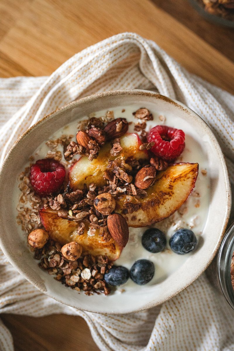Veganer Joghurt mit gebratenem Pfirsich und Granola Topping