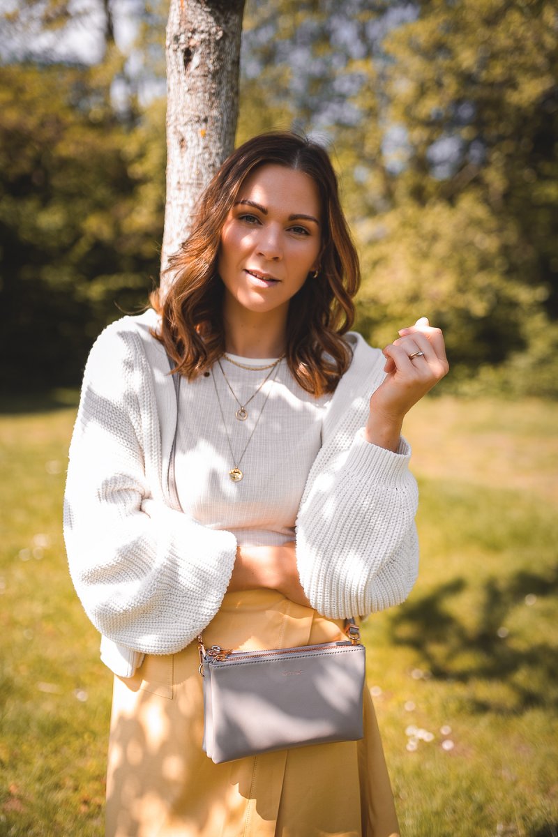 Zu dem Rock kombiniere ich ein weißes Shirt mit Feinrippmuster. Getreu dem Motto: „Was im Winter geht, kann auch im Frühling zum Einsatz kommen“ trage ich einen weißen Cardigan in Kombination. Da der Frühling oftmals mit einer kühlen Brise überrascht, ist das Match mit der dicken Strickjacke einfach perfekt. Diese hält mich warm und verleiht dem Style noch mehr Eleganz.