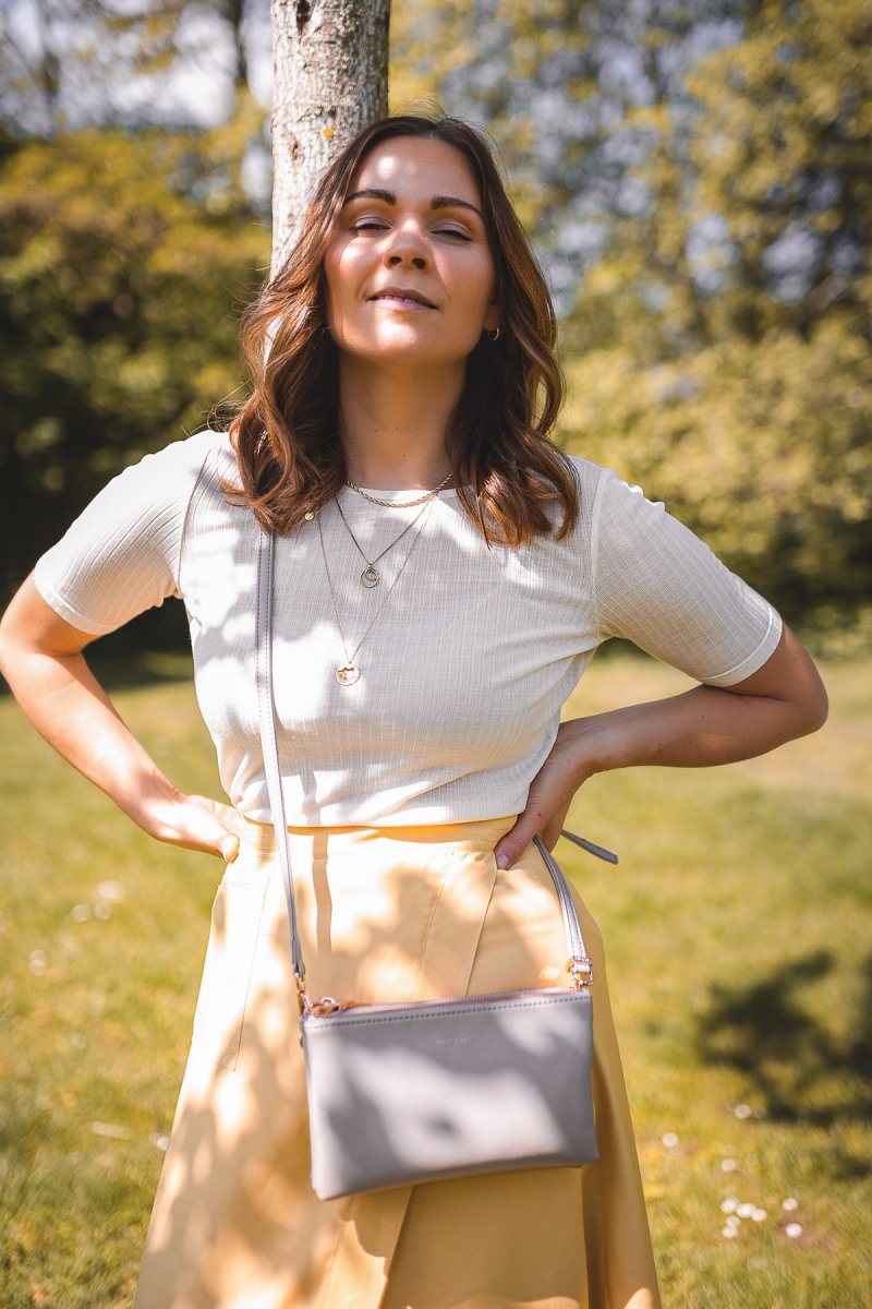 An den Füßen entscheide ich mich für beige Sandalen mit einem kleinen Blockabsatz. Diese strecken mein Bein optisch, was bei einer Midirocklänge nie verkehrt sein kann. Wieder mit dabei ist meine beige Tasche von Matt & Nat ich liebe dieses Modell einfach so sehr! Es ist perfekt für Tage, an denen nur das Nötigste mitgenommen werden soll!