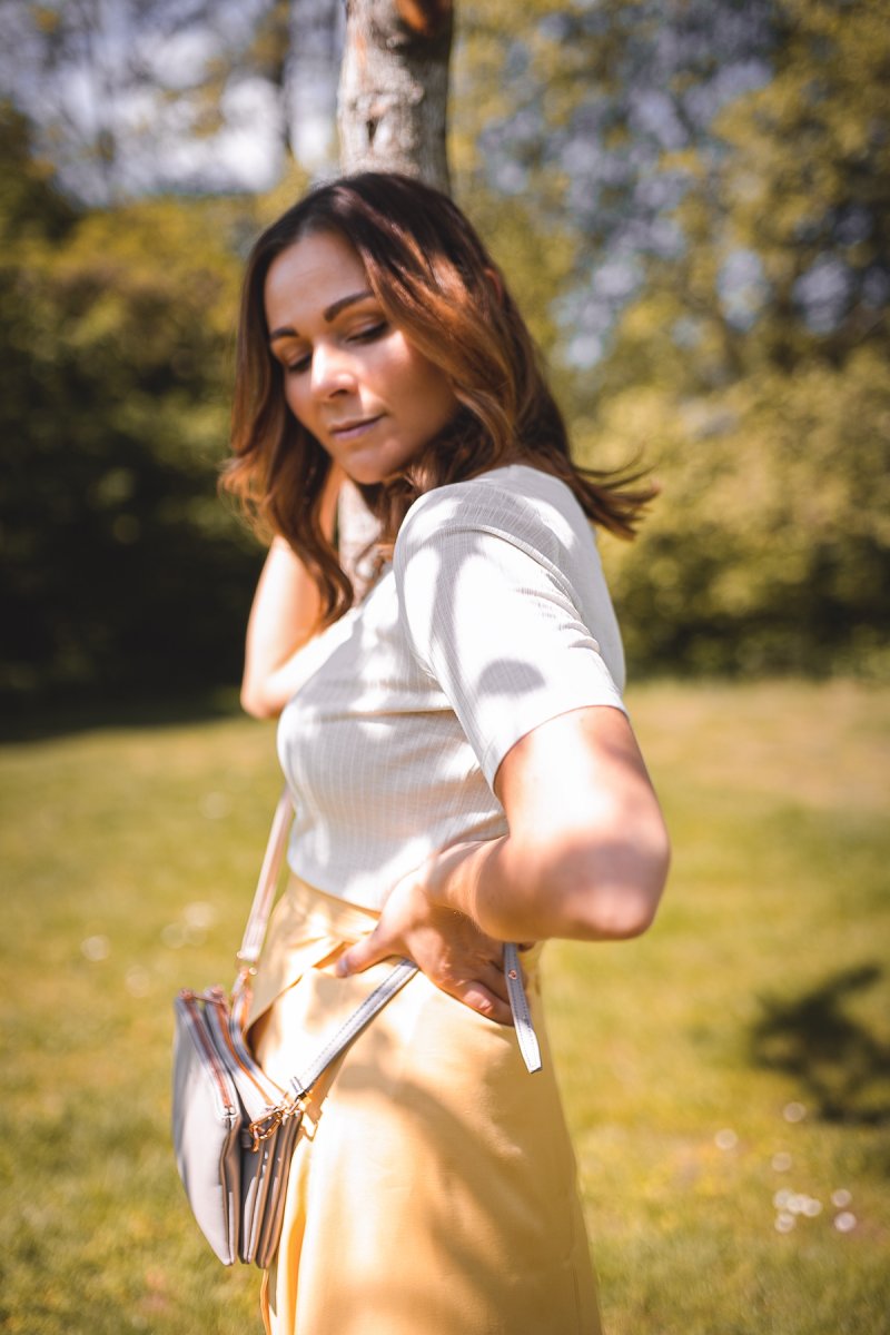 Ich bin seit Jahren ein großer Fan von Midiröcken und kann auch dieser Modesaison nicht die Finger von ihnen lassen. In diesem Frühling setzte ich auf weiche Kontraste und helle Farbnuancen. Der gelbe Midirock kommt da wie gerufen und reiht sich perfekt in die zarten Frühlingsfarben ein. Das leicht satinierte Material lässt den Look sehr elegant wirken – einfach perfekt für ein ganz minimalistisches Frühlings Outfit.