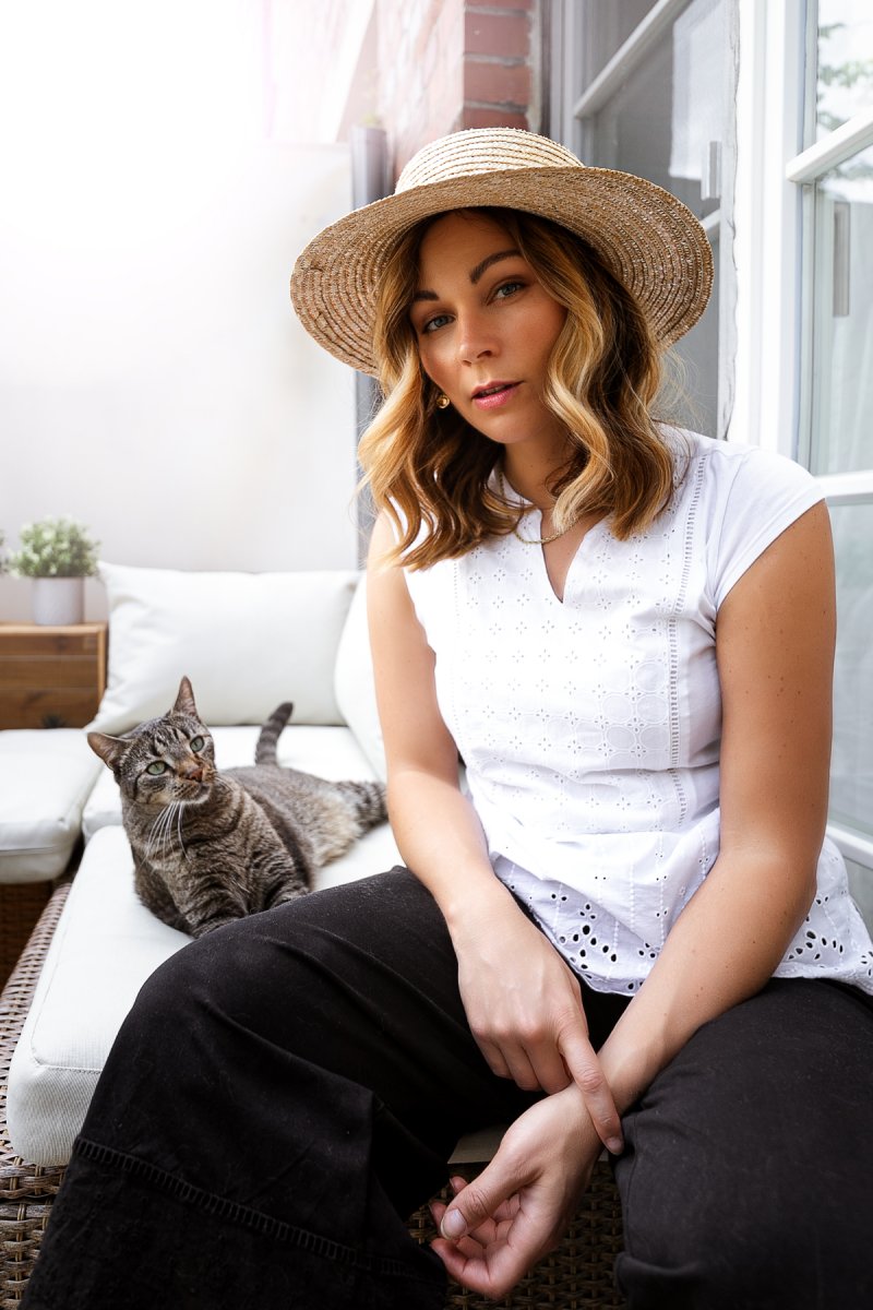 Soll es etwas chicer sein? Kein Problem! Mit einem kleinen Twist wird der sportliche Lifestyle Look zum eleganten Begleiter am Abend. Ich tausche das farbenfrohe Zitronen-Shirt gegen eine weiße Spitzentop und Strohhut ein! Perfekt für ein Abendessen zu zweit! Oder einen Empfang auf Balkon/Terrasse am Abend. Als Gastgeber macht ihr mit diesem Sommer Outfit eine unfassbar gute Figur.