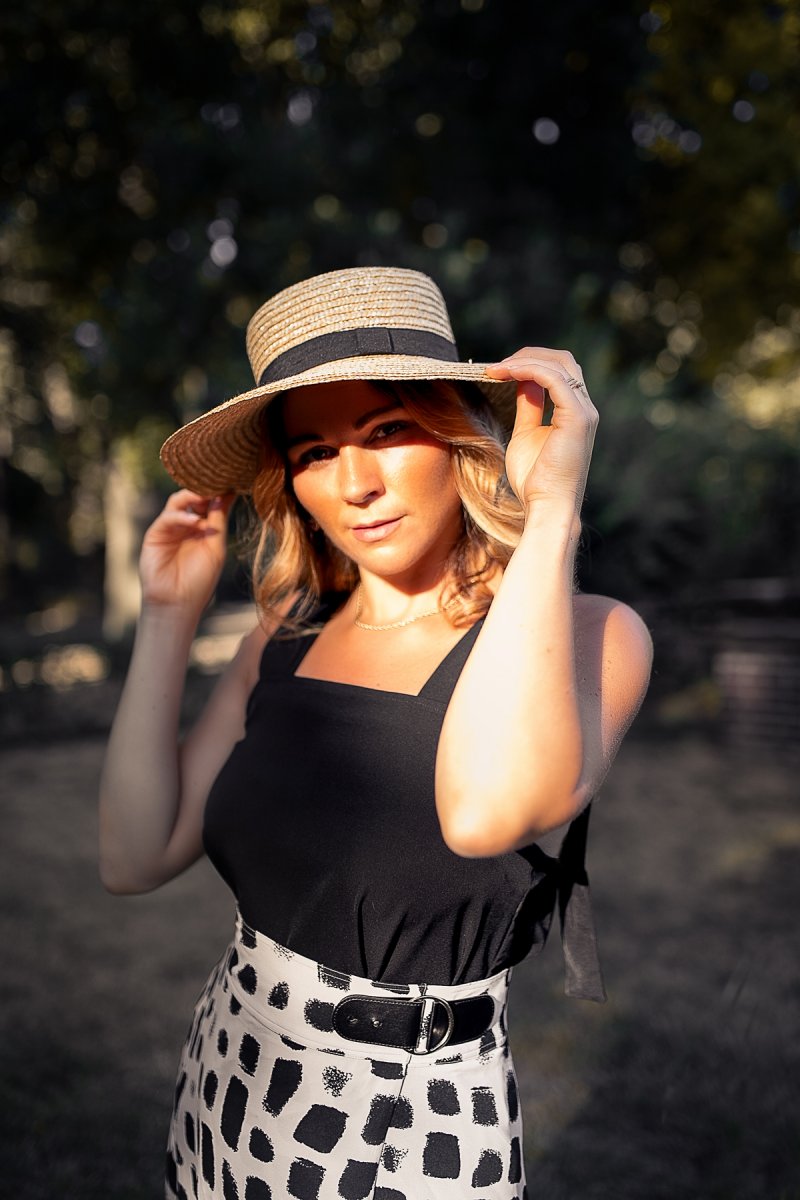 Im Sommer darf es luftig sein! Leichte Stoffe, die die Haut atmen lassen sind dabei meine Favoriten. Und genau so einen Style möchte ich euch heute vorstellen. Ich trage einen eleganten Midirock mit auffälligem Muster in Schwarz-Weiß. Der Rock ist auch an sehr heißen Sommertagen ein zuverlässiger Begleiter und sehr angenehm auf der Haut zu tragen. Dazu kombiniere ich ein schlichtes Basic-Top und schwarzen Sandalen an den Füßen. Das Highlight meines Outfits ist definitiv der Strohhut auf meinem Kopf. Dieser verleiht dem Sommer Outfit ein Feeling von Sommerurlaub wie an der Côte d’Azur.