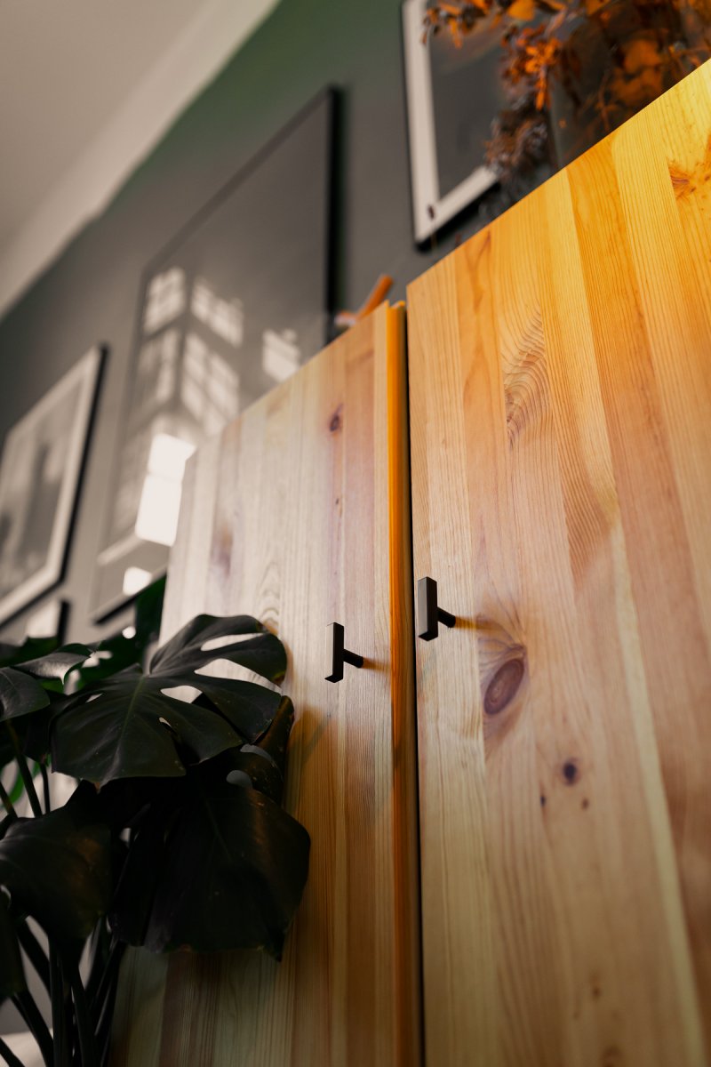 - Jetzt fehlen nur noch die Schrankknöpfe, um den stylishen Schrank zu komplettieren. Ich habe mich für schwarze Schrankknöpfe entschieden. Diese wirken wie kleine Eyecatcher an den sonst sehr schlichten Hochschrank. Mit einem Holzbohrer bohre ich in die Türen zwei kleine Löcher und bringe die Türknöpfe anschließend an. Ich habe meine Griffe bei 41 cm Länge und 4 cm Breite am Schrank angebracht. Alles, was ihr jetzt noch tun müsst, ist, den perfekten Platz für den Schrank zu finden. Ich wünsche euch viel Spaß beim Nachmachen!