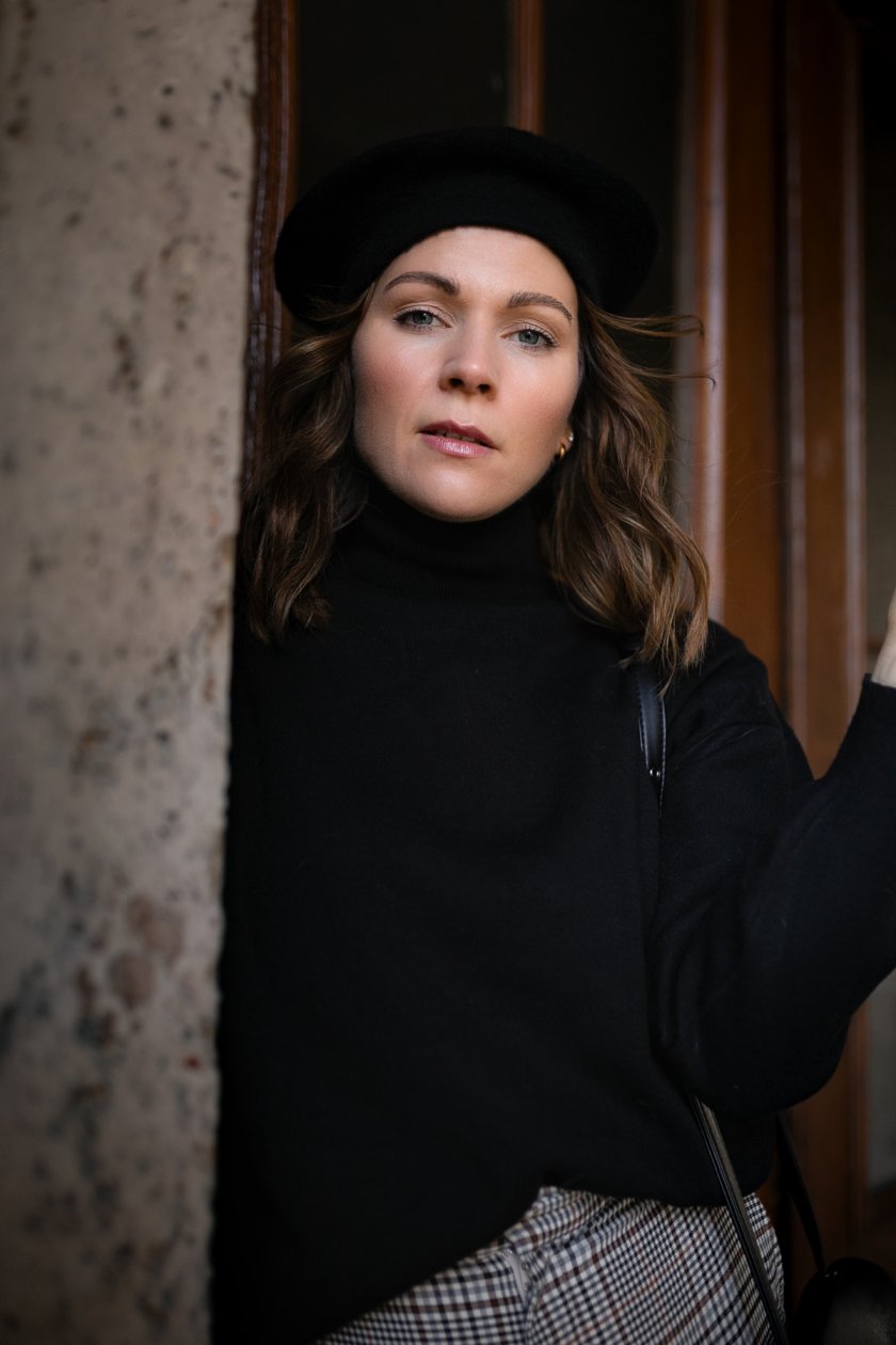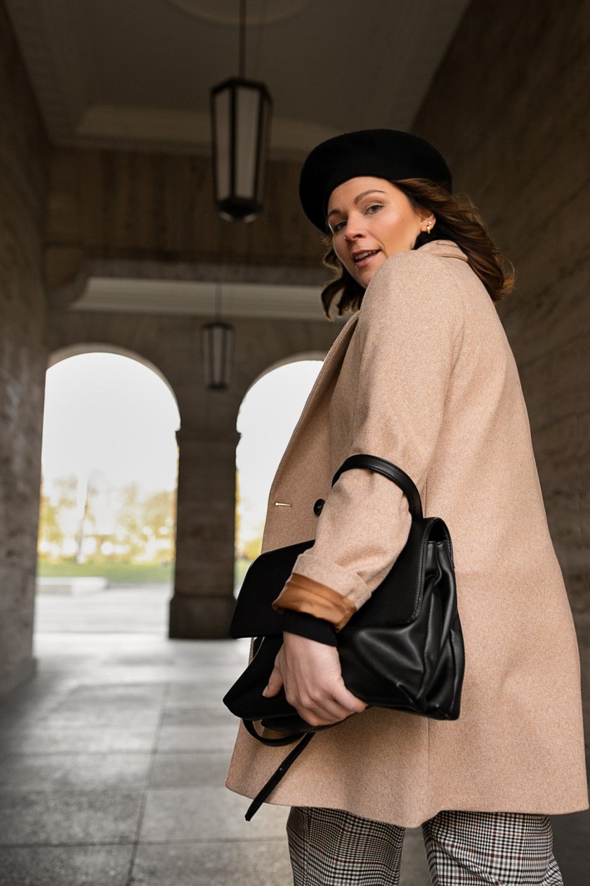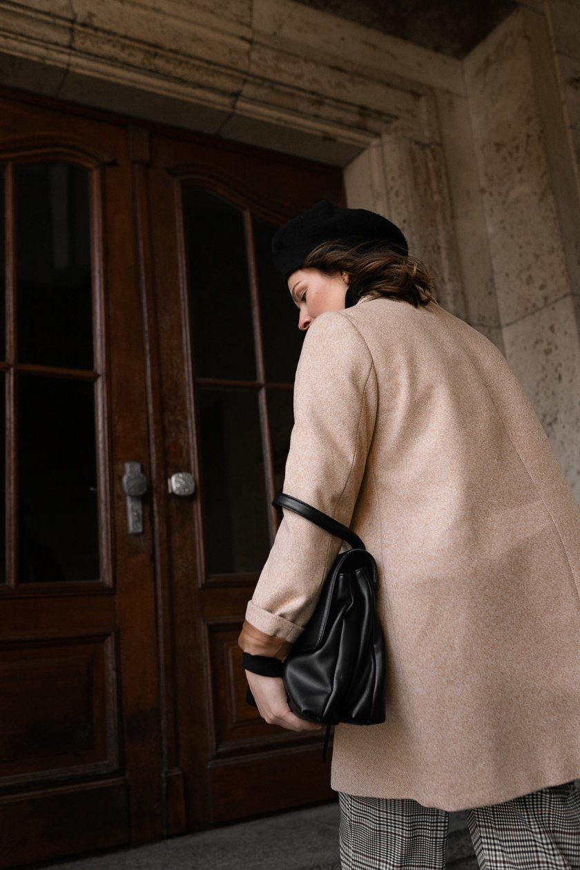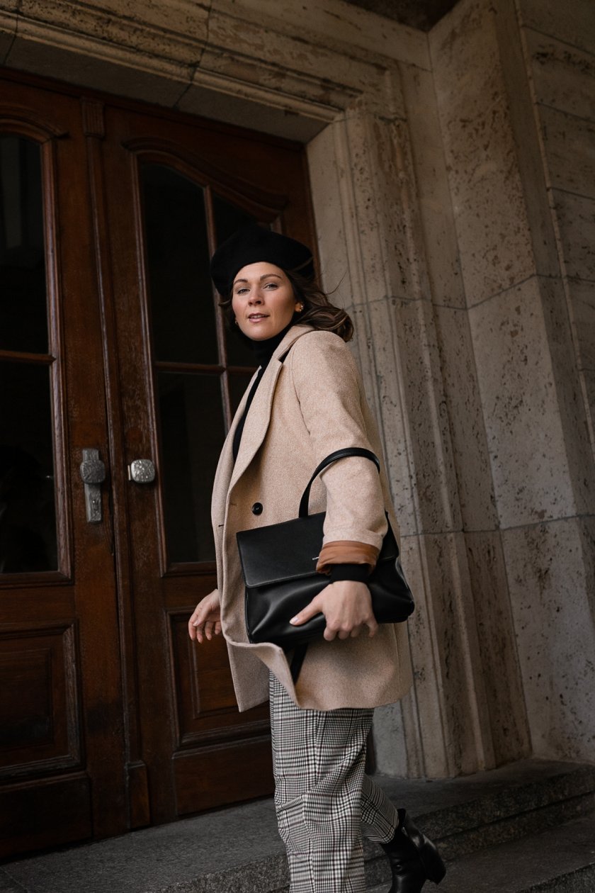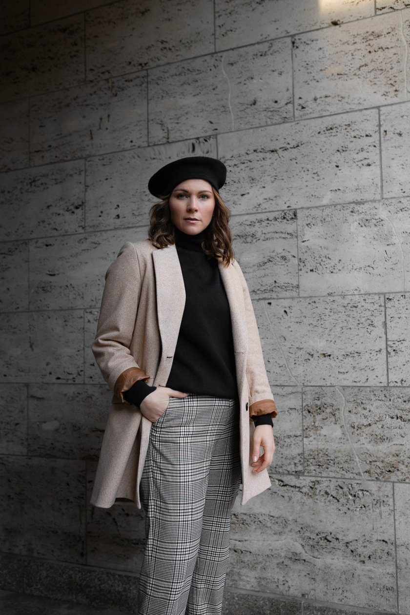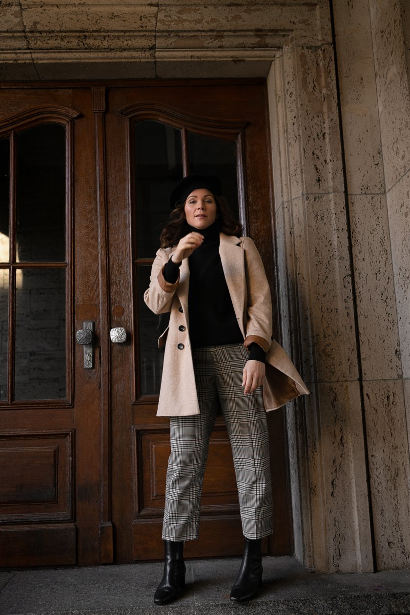 Mein heutiges Blazer-Outfit ist ein Alltaglook, der sich im Herbst und Winter sehr gut tragen lässt. Ich kombiniere einen schwarzen Rollkragenpullover mit einer karieren Hose. Zwei Basic-Teile, die jeder Frau im Schrank haben sollte. Dazu trage ich schwarze Stiefeletten und ein schwarzes Barett auf dem Kopf. Abgerundet wird der Style mit einem beigefarbenen Blazer aus einer Wollmischung, der die hellen Farbnuancen der Hose noch einmal aufgreift und einen schönen Eyechatcher in dem Look bildet. Abgerundet wird mein Outfit mit der schwarzen Tasche von Matt & Nat, die ich euch schon in unzähligen Herbst-Outfits gezeigt habe. In der kälteren Jahreszeit kann der Style noch mit einem dicken Wintermantel kombiniert werden.