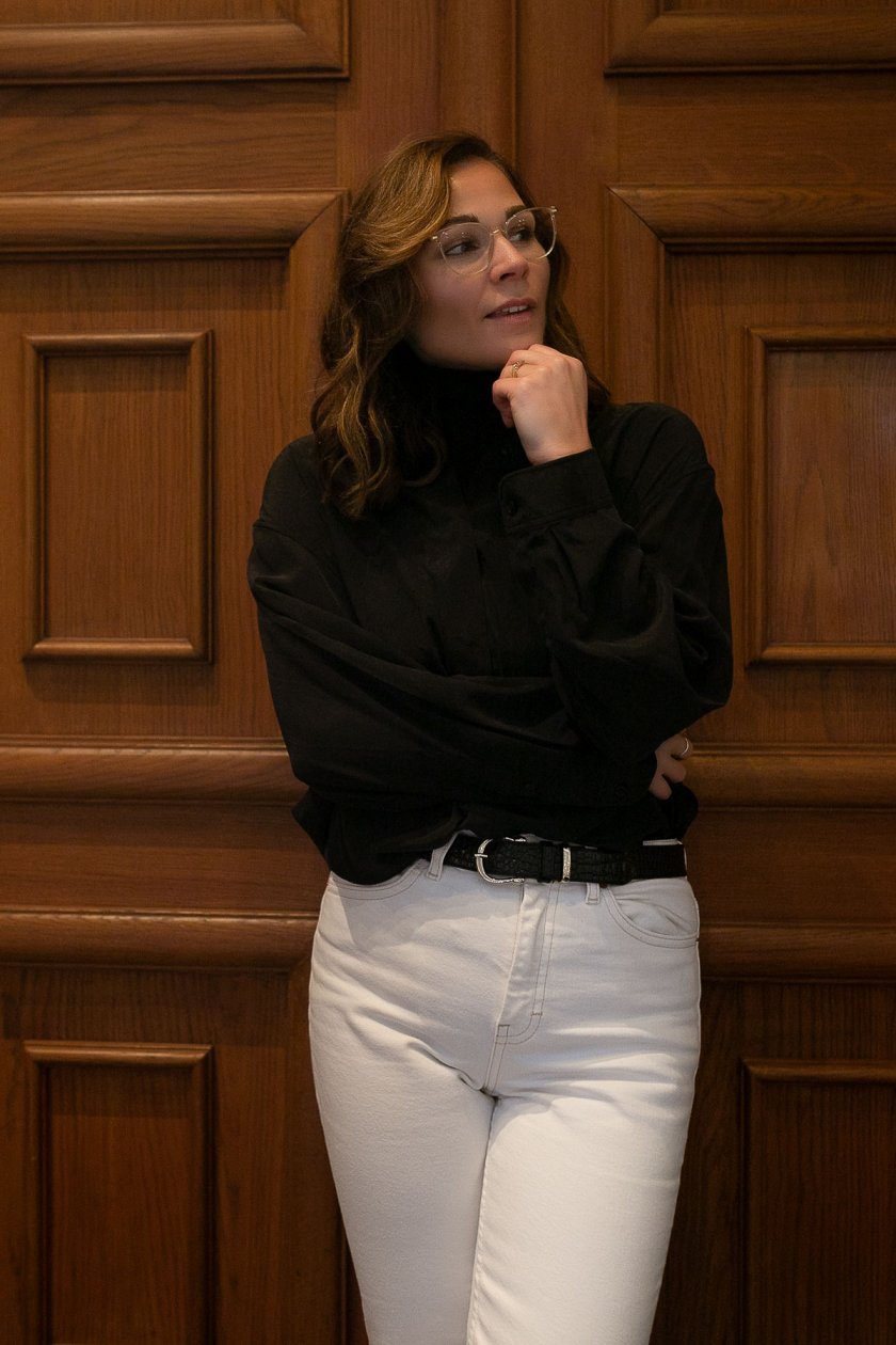Die weiße Jeans ist ein alter Begleiter und ihr habt sie hier auf dem Modeblog schon des Öfteren gesehen. Wie zum Beispiel in diesem bunten Frühlings-Outfit. Die Jeans im geraden Schnitt habe ich mit einem schwarzen Rollkragenpullover und einer ebenfalls schwarzen Bluse kombiniert. Lagenlook ist ja alles im Winter! Auch an den Füßen geht es elegante her, hier setze ich auf klassische Stiefel mit einem derben Einschlag. Ich mag die Eleganz, die diese Stiefel haben und ihre Vielseitigkeit – sie sind perfekt für den Alltag.