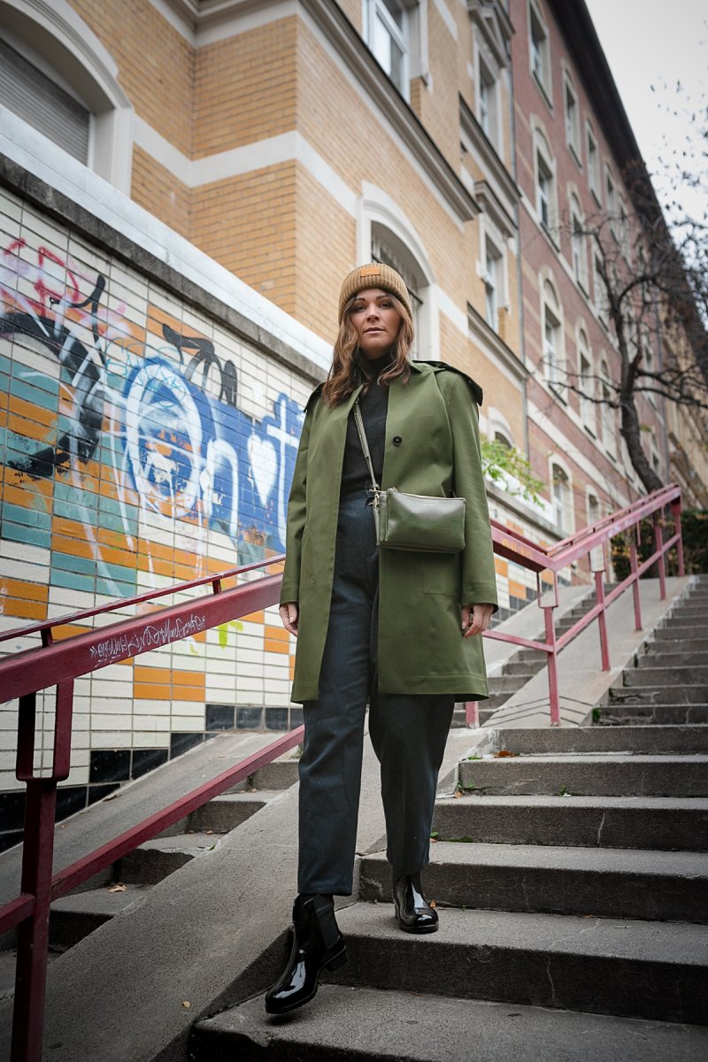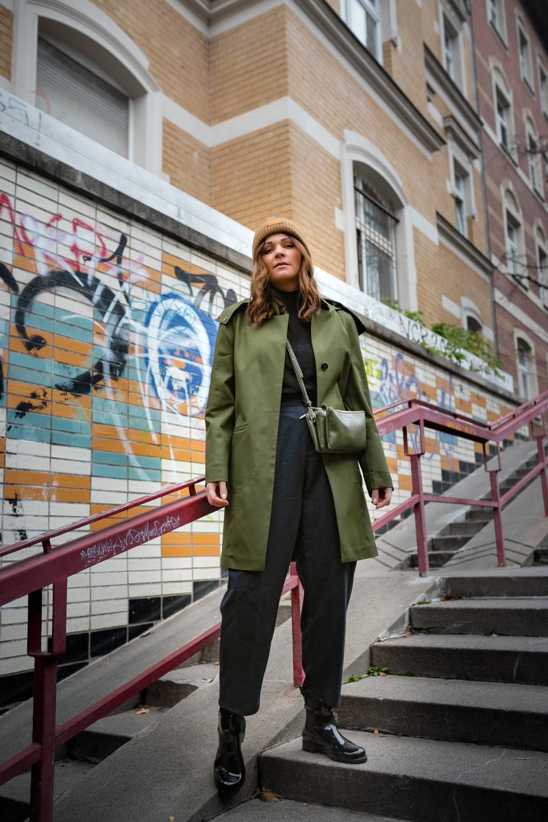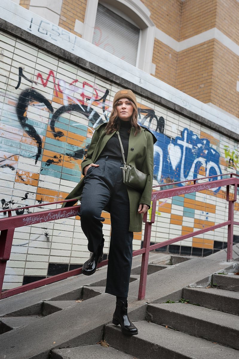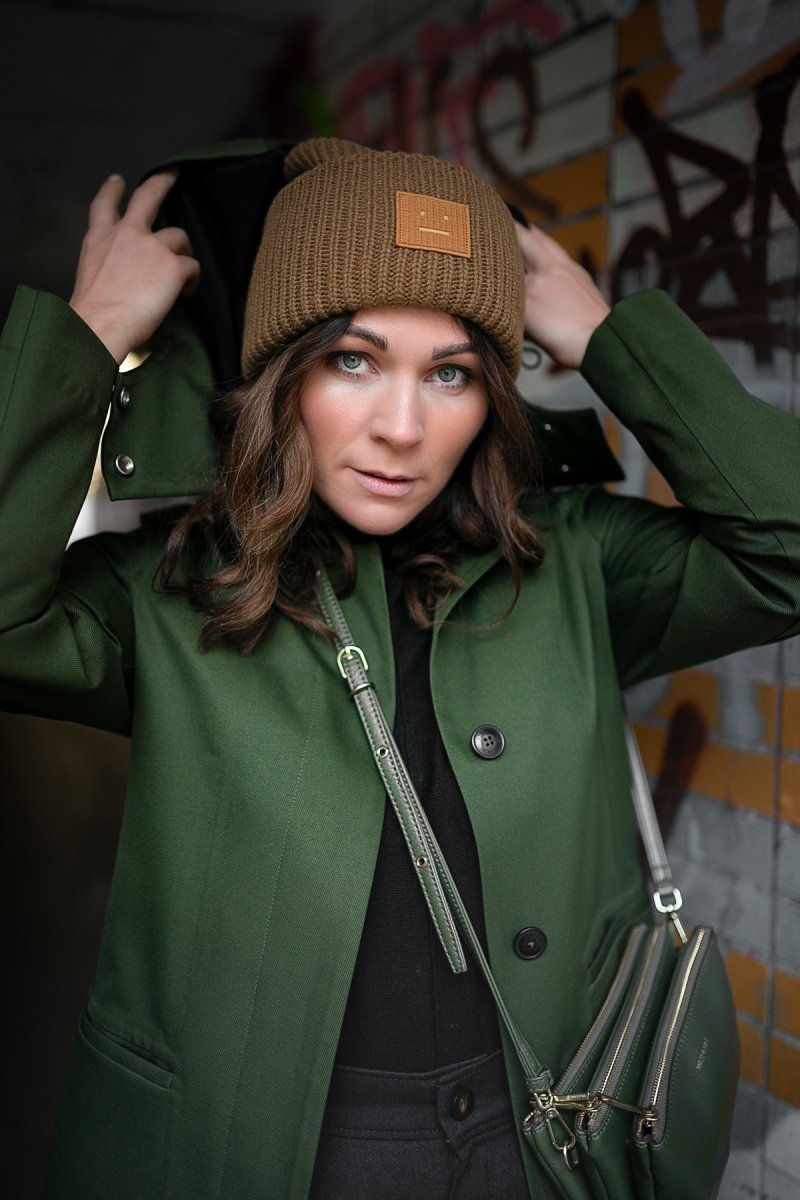 Zu den eleganten Boots trage ich einen lässigen Alltagslook. Mit von der Partie ist meine beige Mütze, die ihr schon aus diesem Winter Outfit kennt. Dazu kombiniere ich eine moosgrüne Regenjacke, die den Look einen kleinen Farbpep verpasst. Das Outfit komplettiert meine grüne vegane Trio-Bag, die ich euch schon in diesem Herbst Outfit vorgestellt habe. Ein weiterer Eyecatcher des Looks ist die Bundfaltenhose mit weitem Schnitt. Sie ist aus Baumwolle und hält im Winter superwarm.