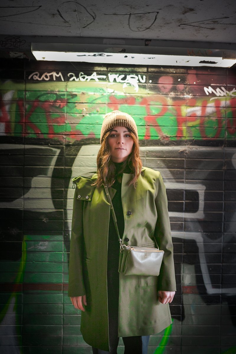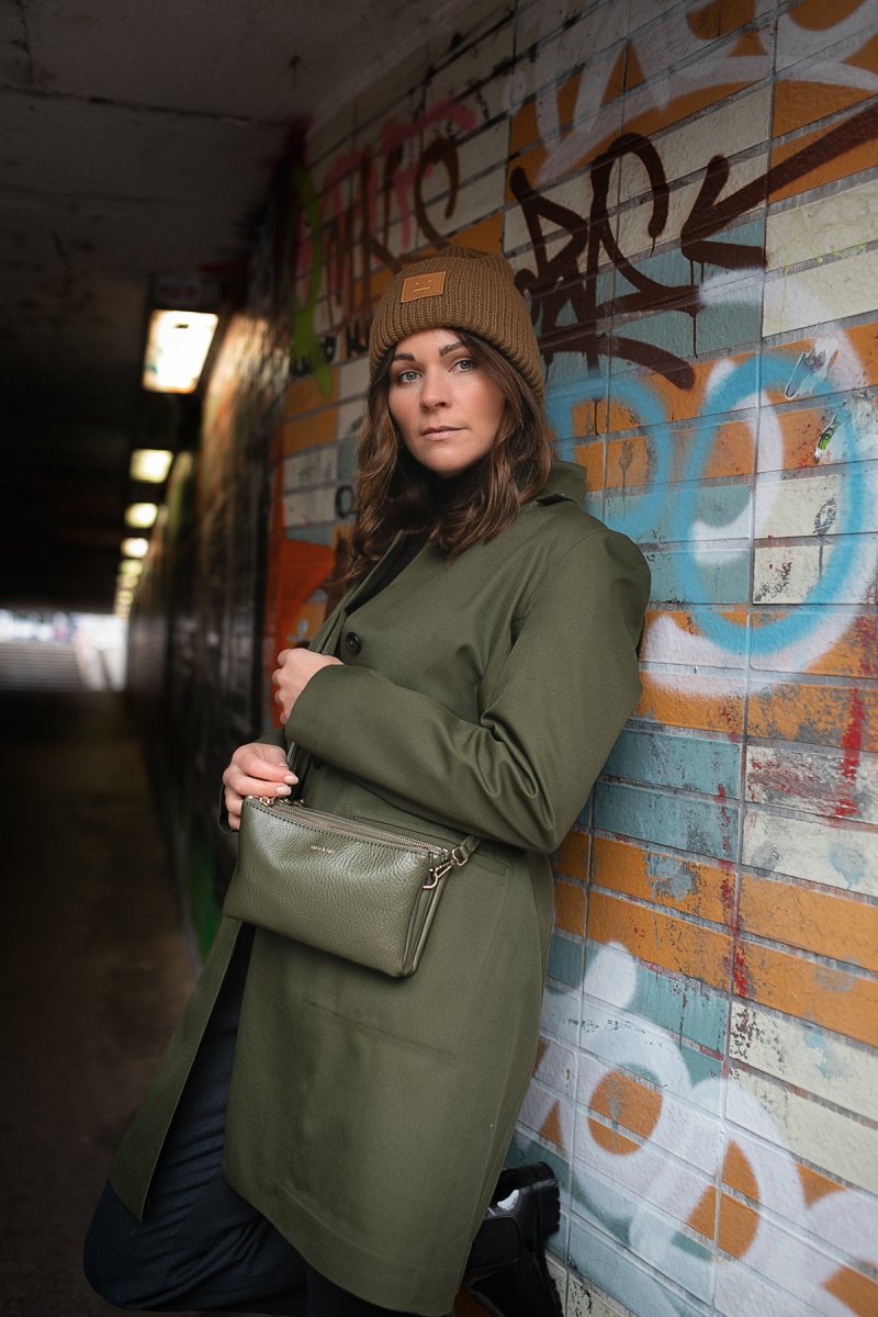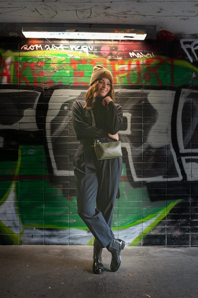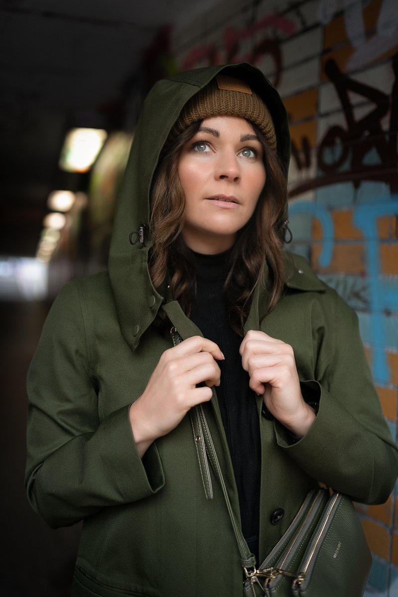 Zu den eleganten Boots trage ich einen lässigen Alltagslook. Mit von der Partie ist meine beige Mütze, die ihr schon aus diesem Winter Outfit kennt. Dazu kombiniere ich eine moosgrüne Regenjacke, die den Look einen kleinen Farbpep verpasst. Das Outfit komplettiert meine grüne vegane Trio-Bag, die ich euch schon in diesem Herbst Outfit vorgestellt habe. Ein weiterer Eyecatcher des Looks ist die Bundfaltenhose mit weitem Schnitt. Sie ist aus Baumwolle und hält im Winter superwarm.