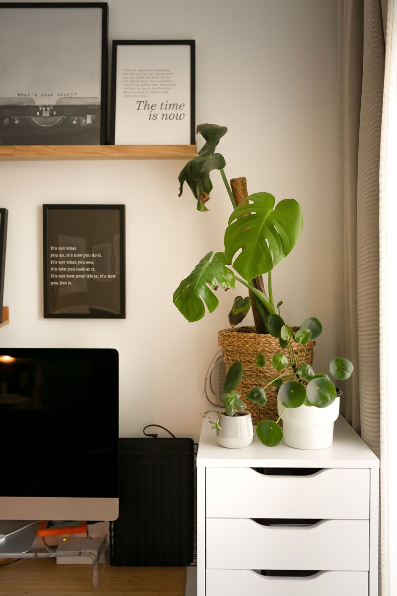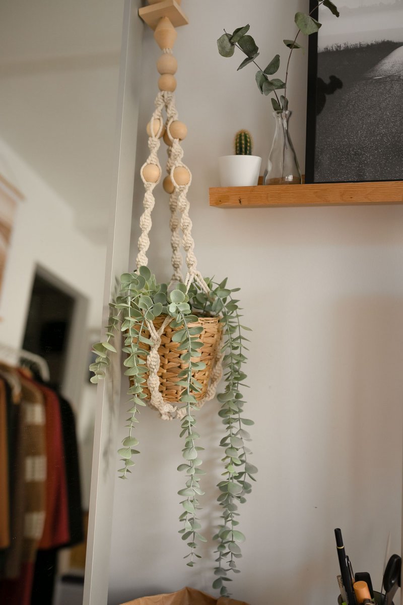 Pflanzen gehören für mich zum Arbeiten dazu. Ich finde, sie haben etwas Beruhigendes und sind dazu noch schön anzusehen. Egal ob sie echt oder künstlich sind, sie werten euren Arbeitsplatz auf jeden Fall auf. Ich habe neben einigen Grünpflanzen auch einen künstlichen Eukalyptus in einer Makrameeblumenampel gleich neben meinem Schreibtisch hängen.